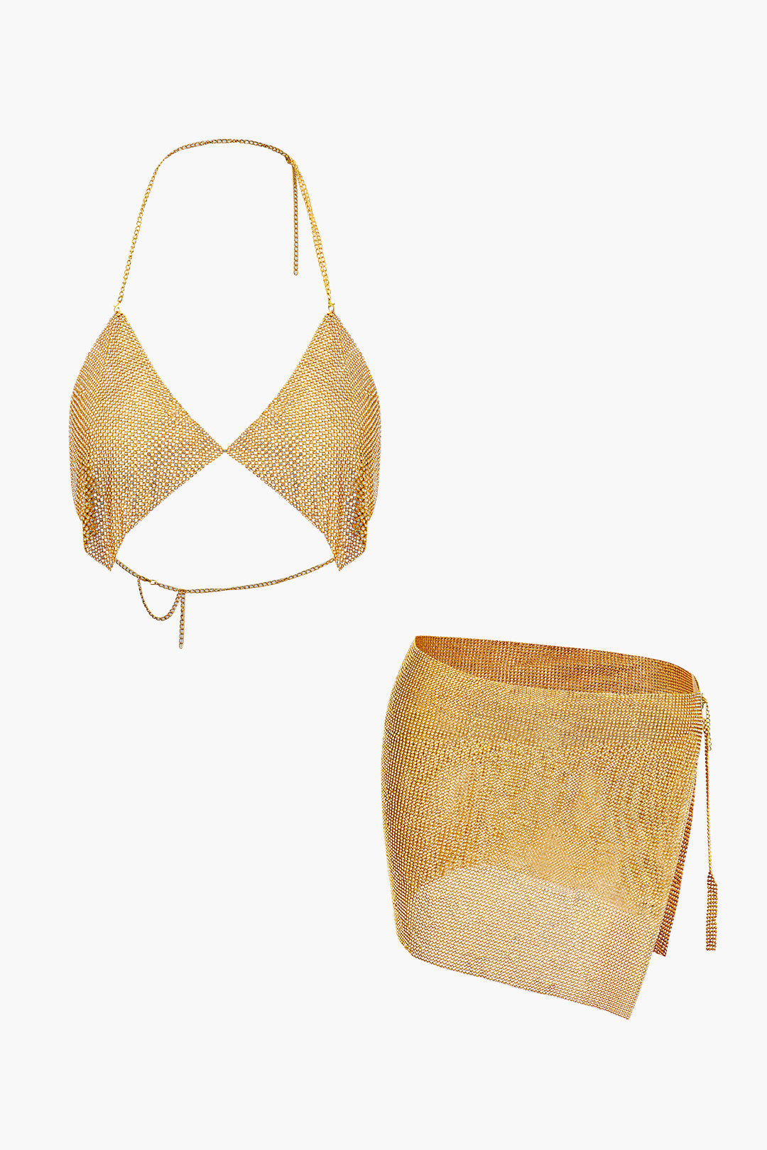 Rhinestone Chain Tie Halter Cami Top And Split Mini Skirt Set