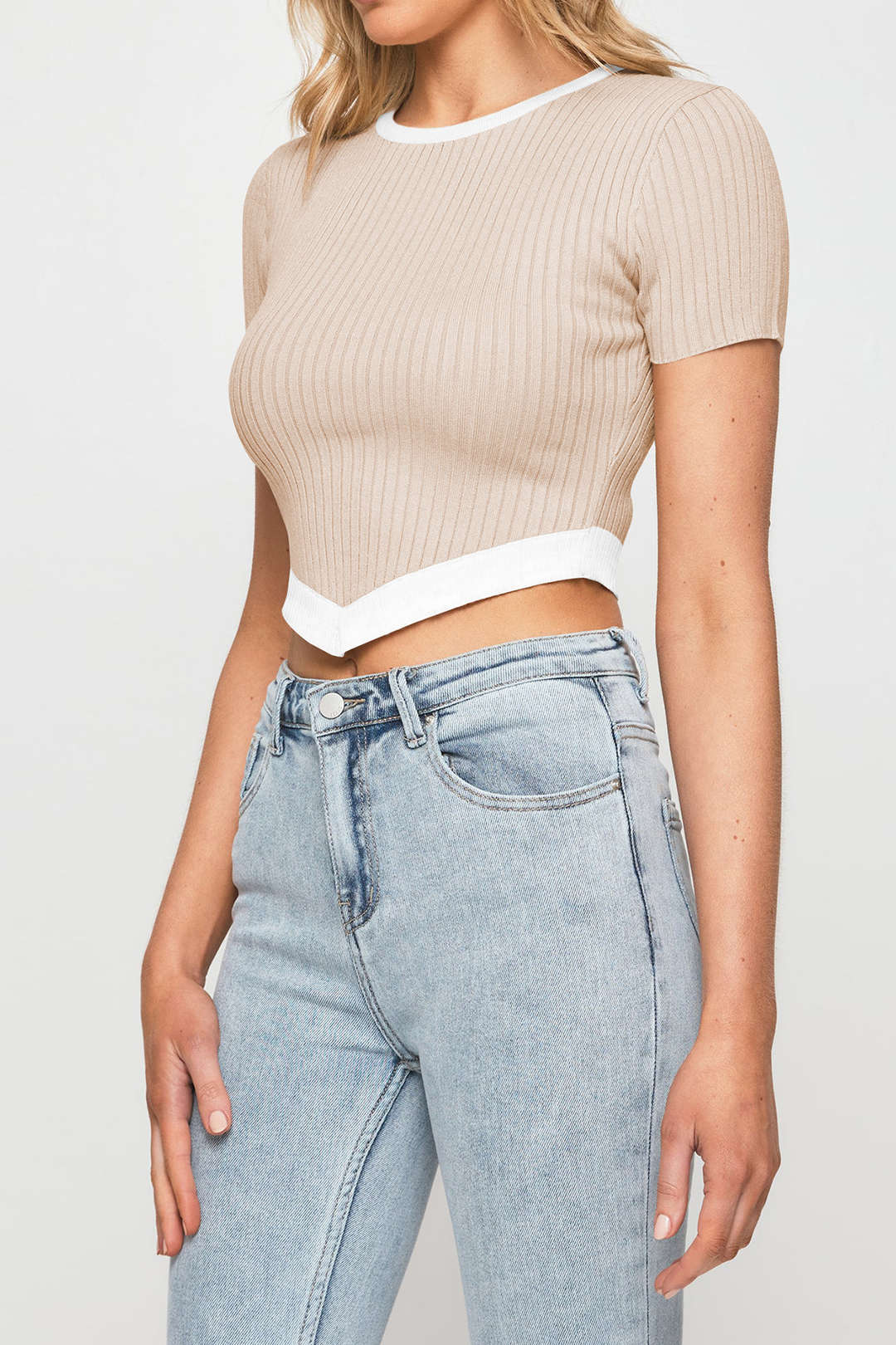 Contrast Trim Round Neck V-hem Rib Knit T-shirt