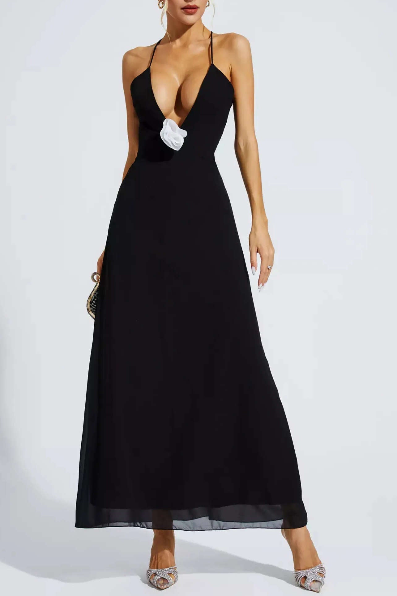 3D Flower Cross Tie Backless Deep V-neck Maxi Dress