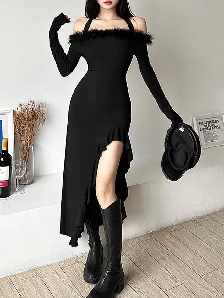 Long-Sleeve Plain Fluffy Trim Ruffle Slit Midi Dress