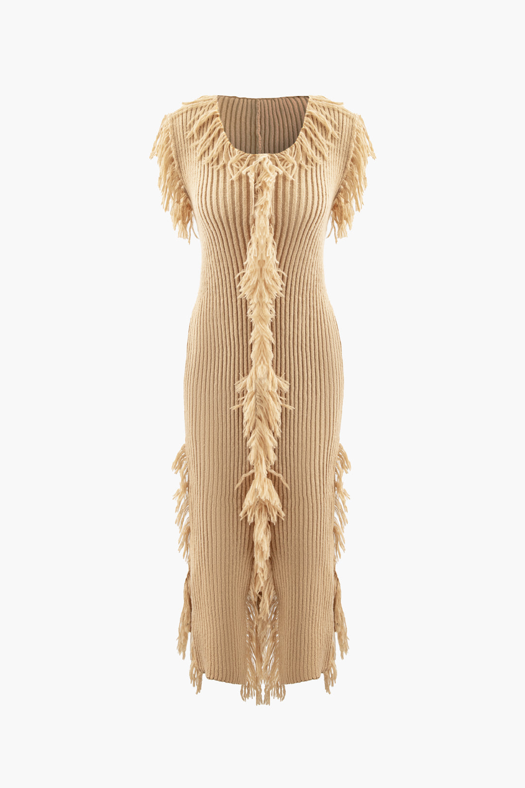 Fringe Square Neck Sleeveless Slit Knit Maxi Dress