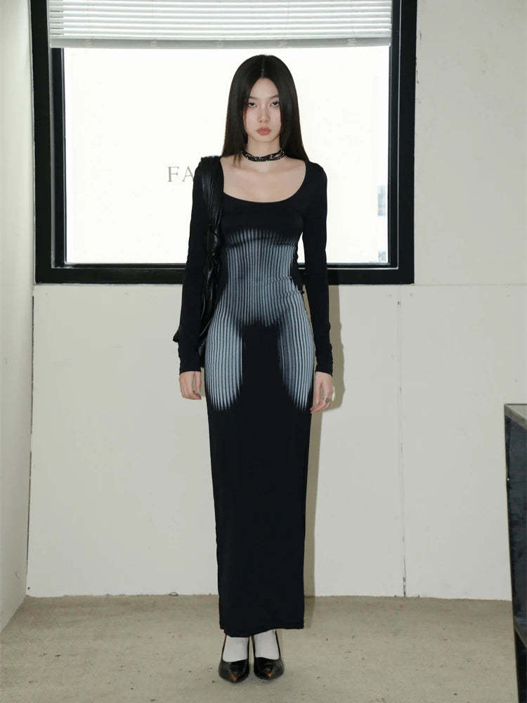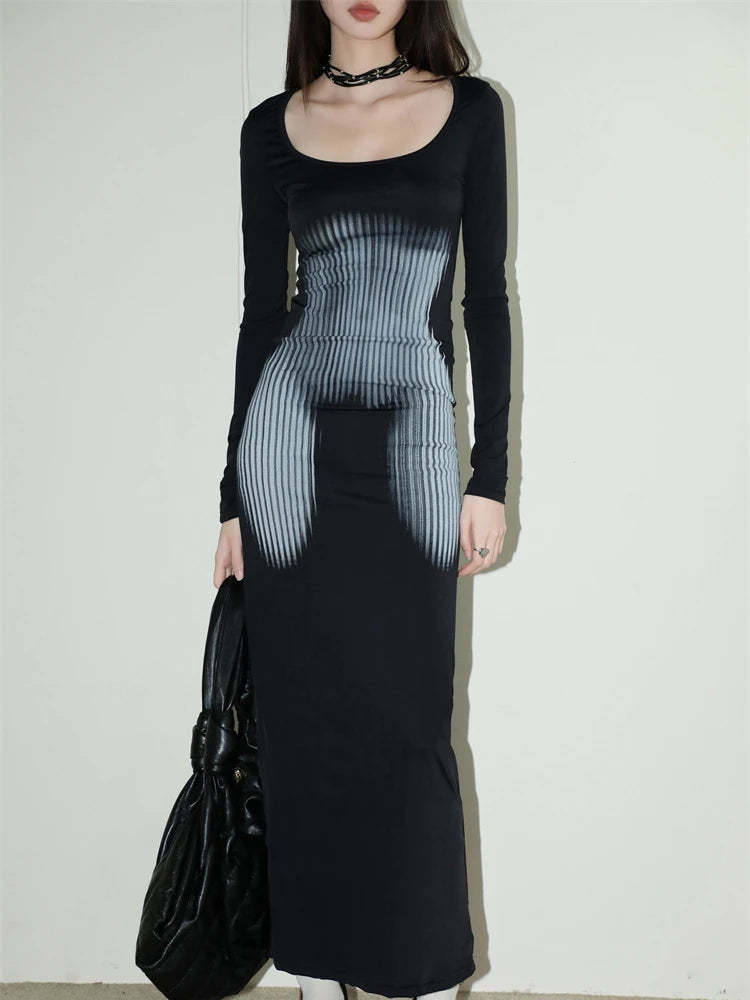 The unique print creates an eye-catching optical illusion that contours and accentuates. while the long sleeves and elegant neckline add a touch of sophistication. Perfect for evening events or special occasions. this dress pairs seamlessly with minimalist accessories to let its daring design shine. Elevate your wardrobe with this piece and enjoy the fashion in every wear.