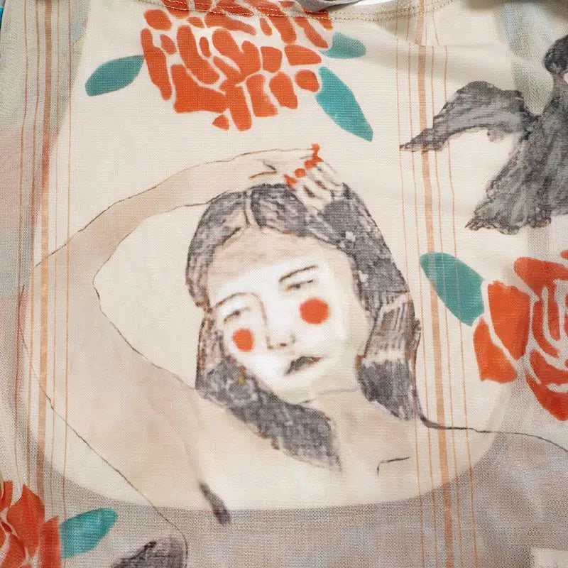 Wrap yourself in the boldness of art with this top. With every thread. it weaves a tale of modern aesthetics. featuring an evocative print that's as enigmatic as it is stylish. This piece isn't just a garment—it's a statement. blurring the lines between clothing and art. Whether you're gracing a gallery or the city streets. this top is a testament to the beauty of self-expression.