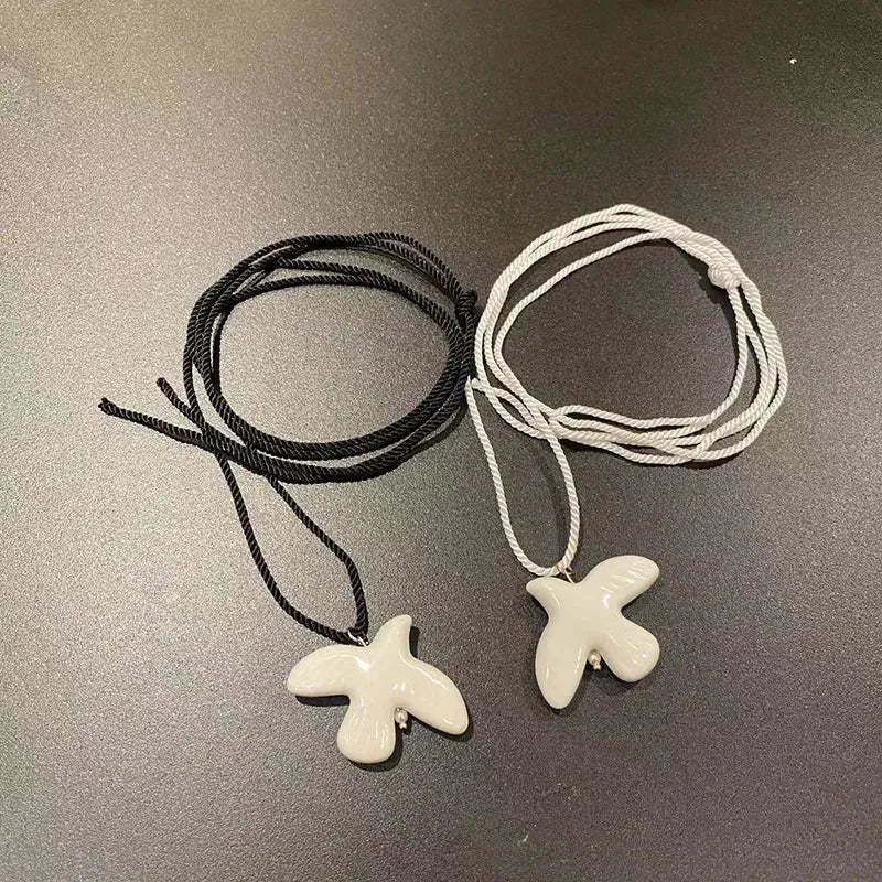 Delicate and expressive. this bird-inspired jewelry set brings a soft. sculptural touch to your look. The necklace features a minimalist ceramic bird charm suspended on a long black cord that ties into a bow for adjustable styling. Paired with matching earrings. this set blends artful elegance with everyday wearability.