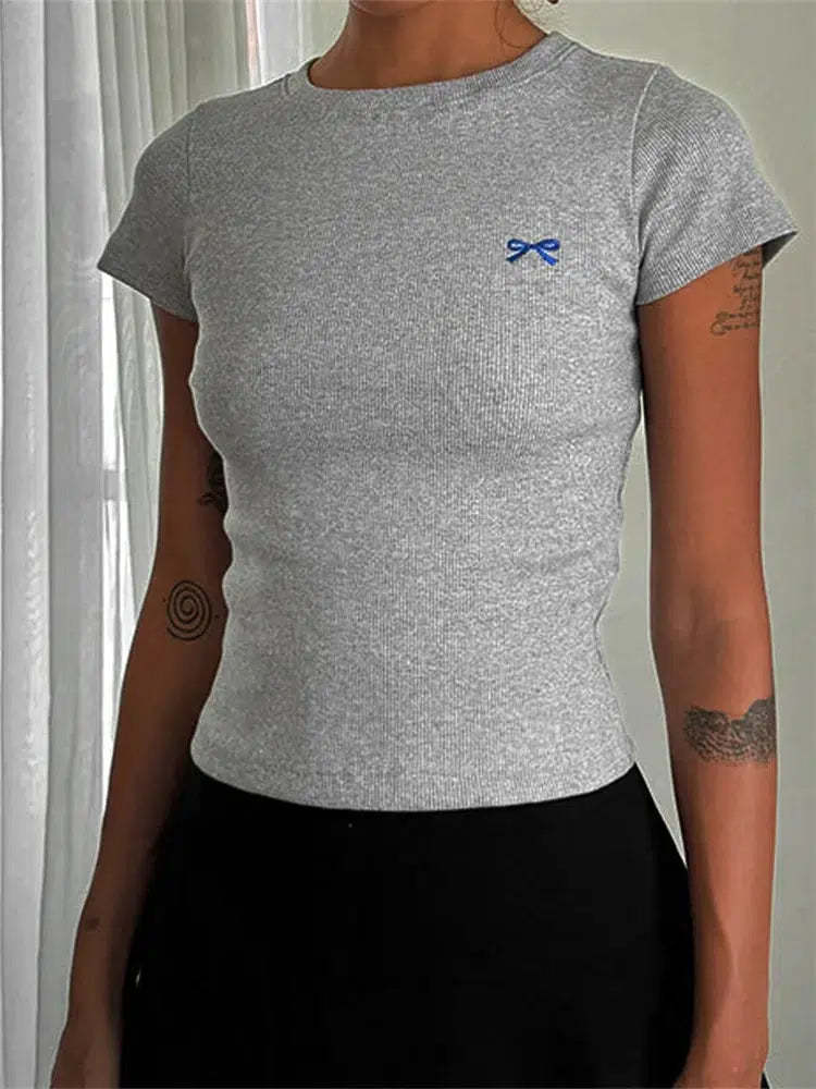 This basic tee blends comfort and style with its soft ribbed fabric and a cute bow embroidery. The pastel pink color adds a touch of sweetness. making it a perfect choice for everyday wear. Pair it with your favorite jeans or skirt for a casual yet chic look that fits effortlessly into any wardrobe. Ideal for achieving a soft girl aesthetic. this tee is a versatile must-have.