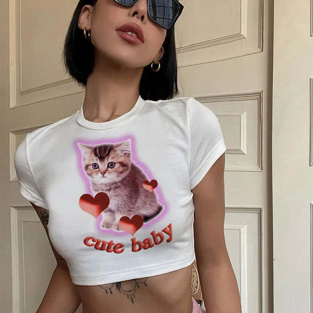 The Cute Baby Cat Baby Tee is a playful choice for cat lovers. featuring an adorable kitten graphic with heart icons. Its fitted. cropped design offers a trendy look. pairing easily with high-waisted jeans. skirts. or shorts.