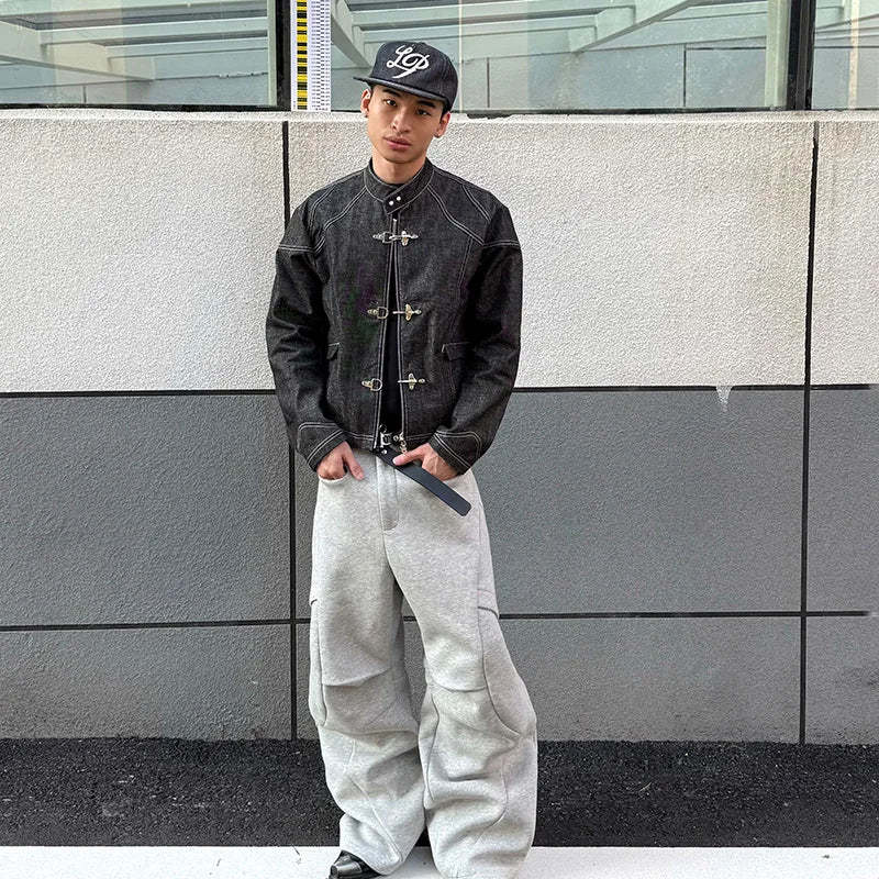 This clasp denim jacket features a structured silhouette with metal clasp closures that add a bold. utilitarian edge. Made from durable denim fabric. it holds its shape while remaining comfortable for daily wear. The clean lines and minimal detailing make it easy to style with jeans. cargos. or layered looks. Designed for modern men's fashion. this jacket fits naturally into casual men style and contemporary men clothing wardrobes. A strong outerwear piece that balances function and statement design.