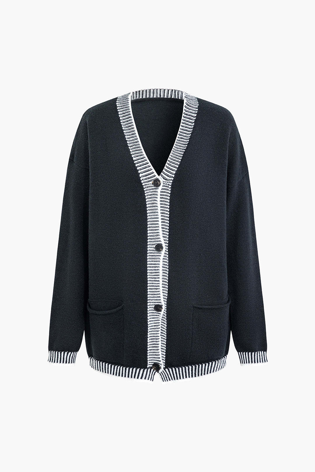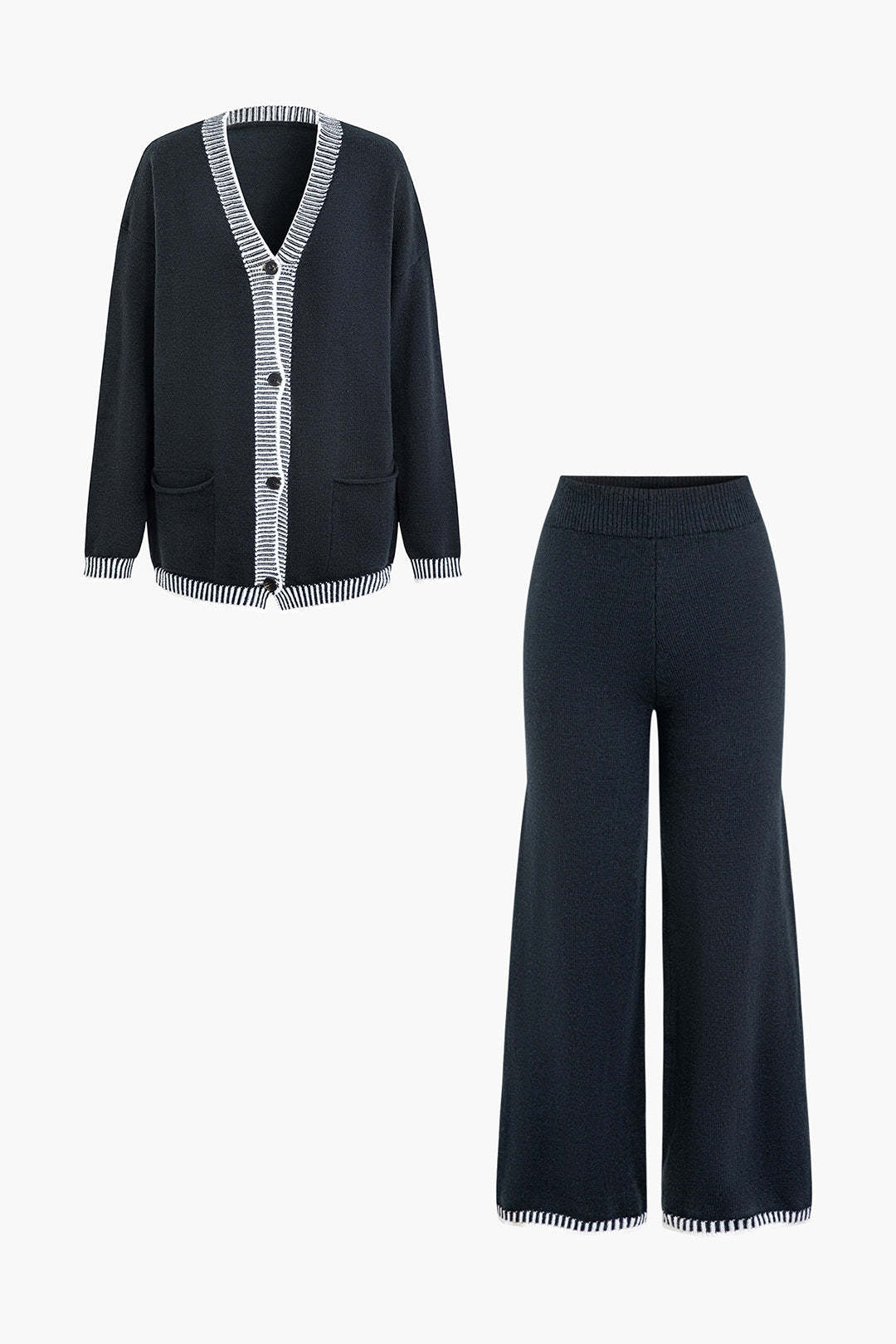 Contrast Stripe Trim V-neck Button Up Cardigan And Straight Leg Pants Set