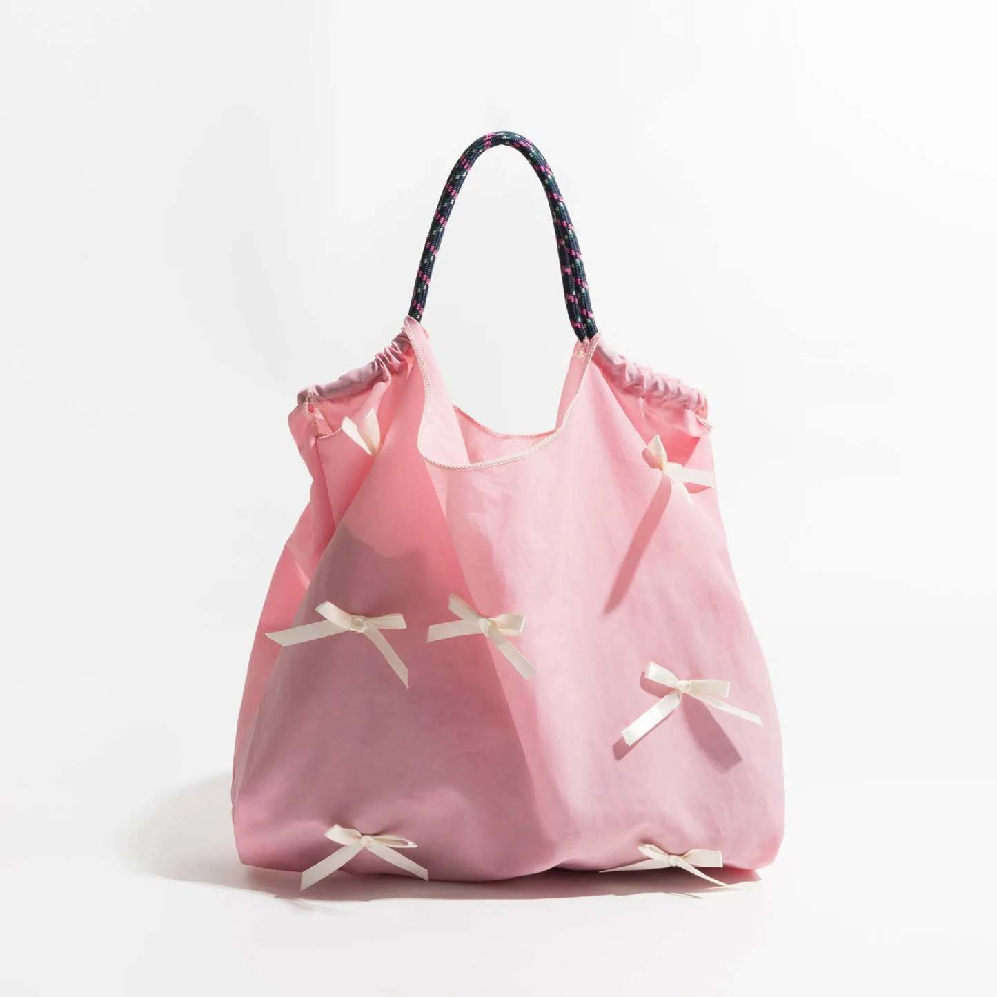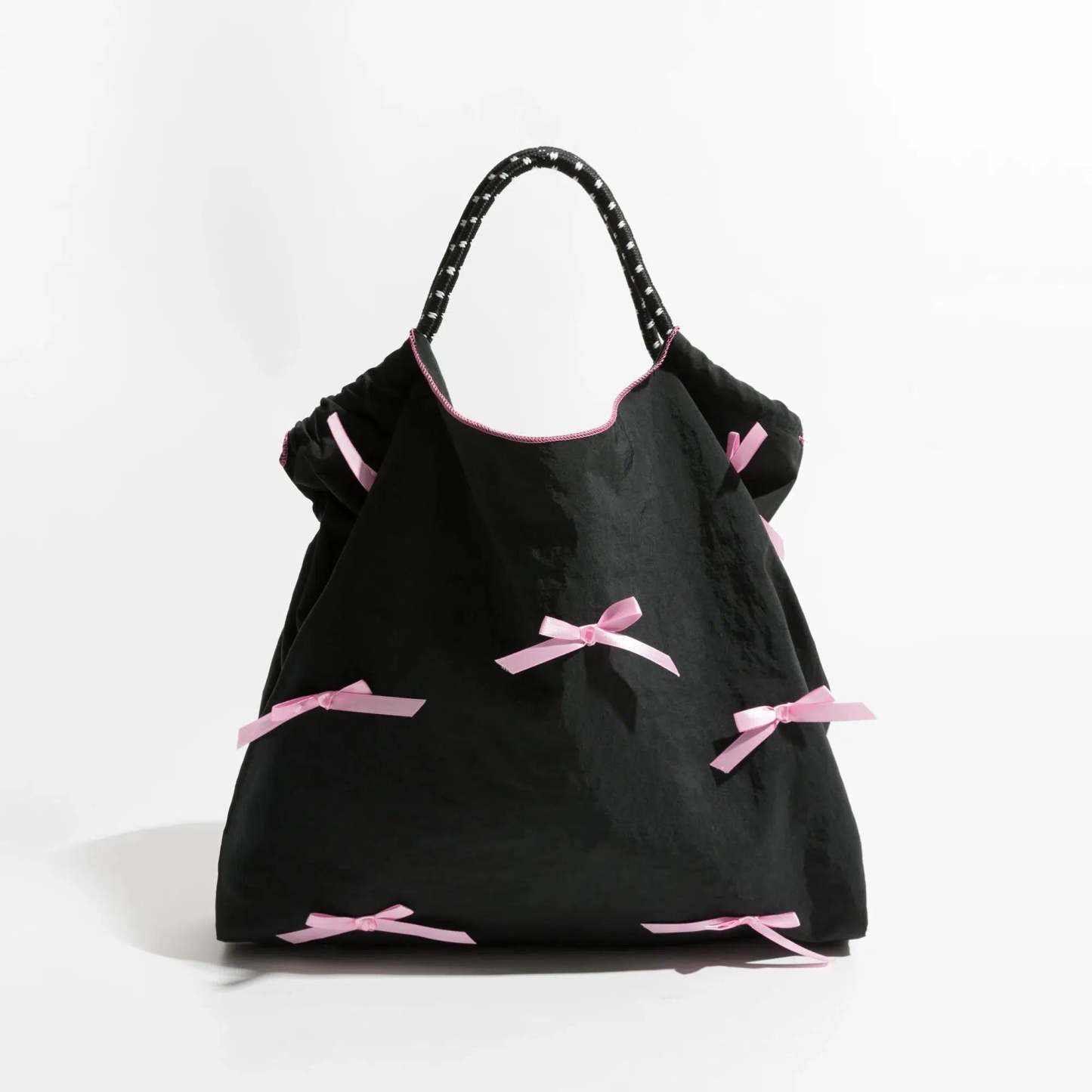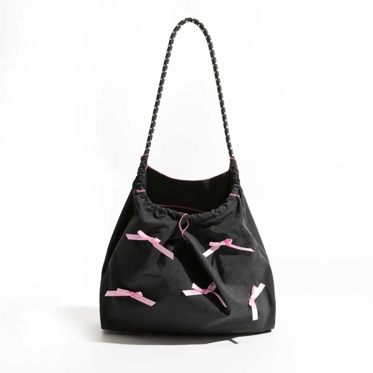 Delight in the playful elegance of this soft pink shoulder bag adorned with whimsical bows. Its roomy interior is perfect for carrying everyday essentials while adding a touch of charm to your outfit. Ideal for casual outings. this bag pairs wonderfully with soft knits and floral prints to create a harmonious. feminine ensemble.