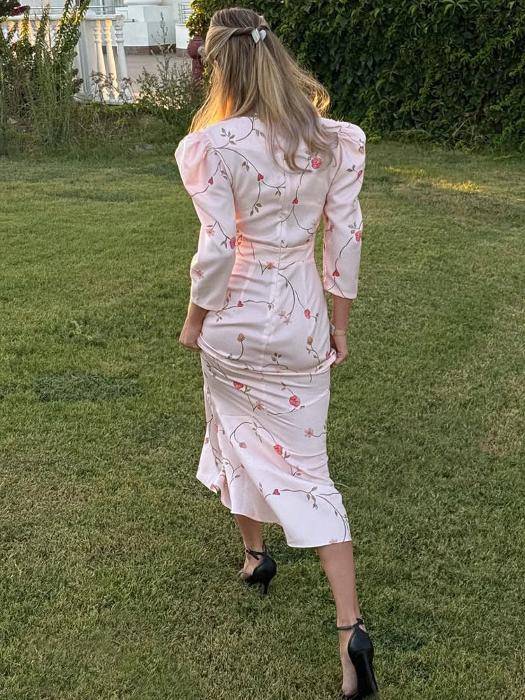 A peach-toned midi dress with delicate floral prints and structured shoulders for a romantic yet bold look. The deep V-neckline and tailored waist create a flattering silhouette. while the soft flowy skirt channels cottagecore elegance.