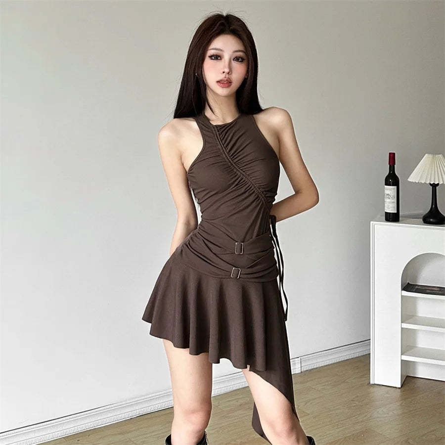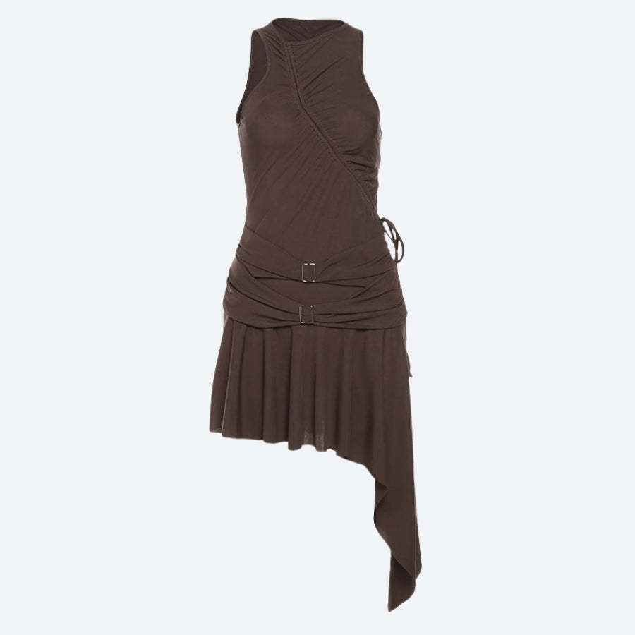 Bring futuristic edge to your wardrobe with this ruched asymmetric mini dress. The structured halter neckline meets bold side buckles and a high-low hem for a sculpted. street-cool silhouette. Stretch fabric hugs your shape. while the details give it a cyber-inspired punch—ideal for parties. streetwear looks. or creative nights out.