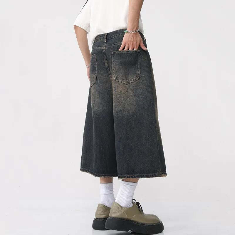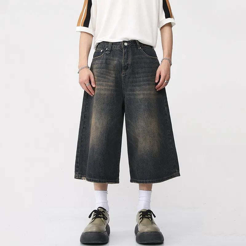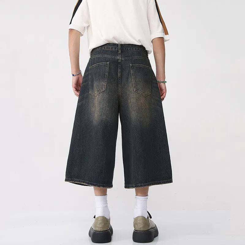 Discover the fusion of vintage and modern with these dark-washed jean capri shorts for men. From a zip & button fastening to the timeless 5-pocket design. they masterfully land at knee length. Boasting a wide leg and high waist. these shorts in a deep blue hue are the epitome of relaxed sophistication.