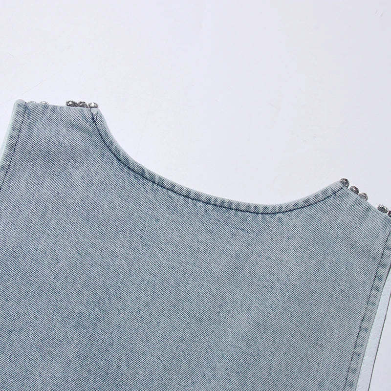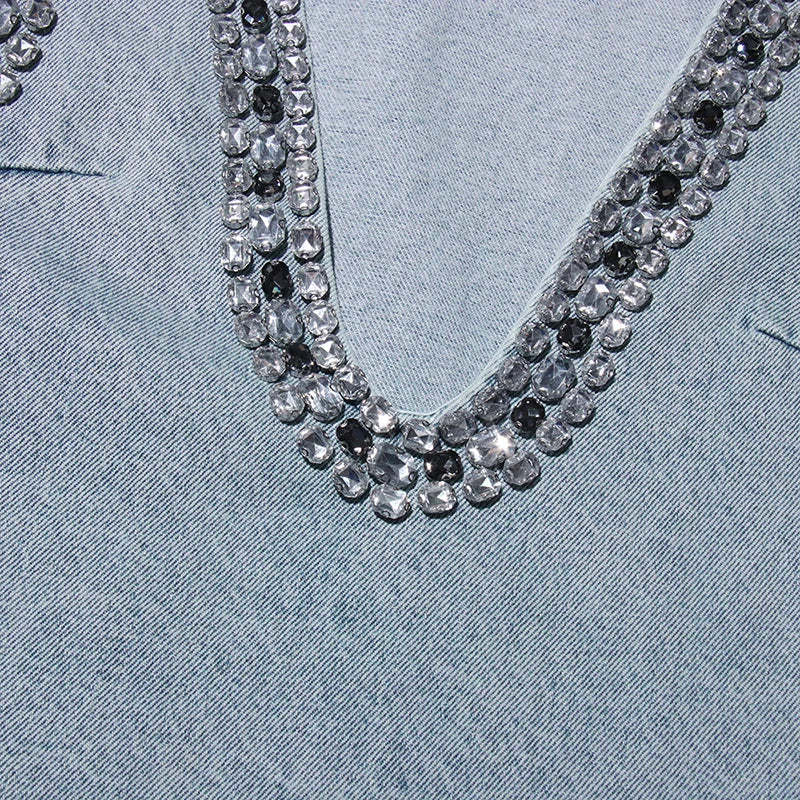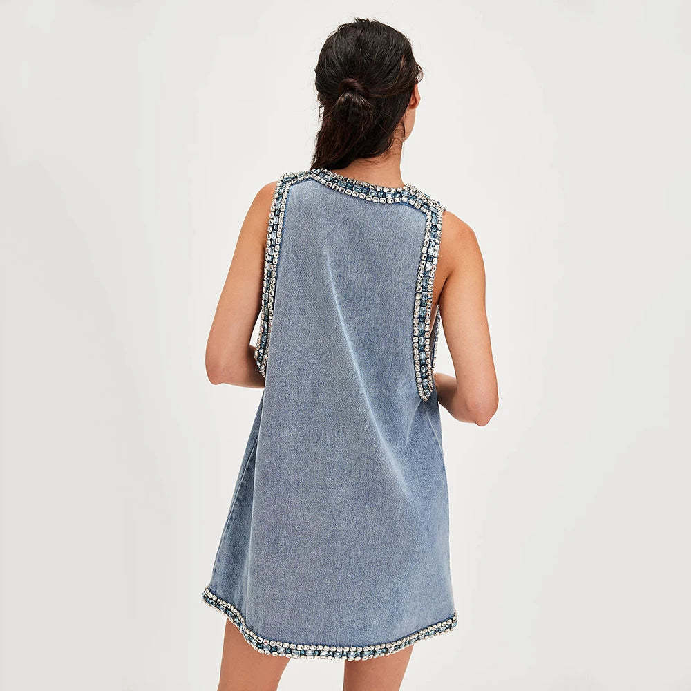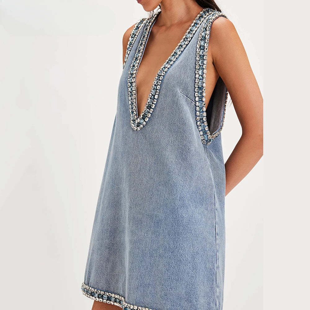 Bold and daring. this denim mini dress brings street style to life with its deep plunging neckline and sparkling jewel trim. Designed to catch the light and attention. the sleeveless cut gives it a sleek edge. Perfect for nights out or styled casually with boots. it's a versatile piece with a statement finish.