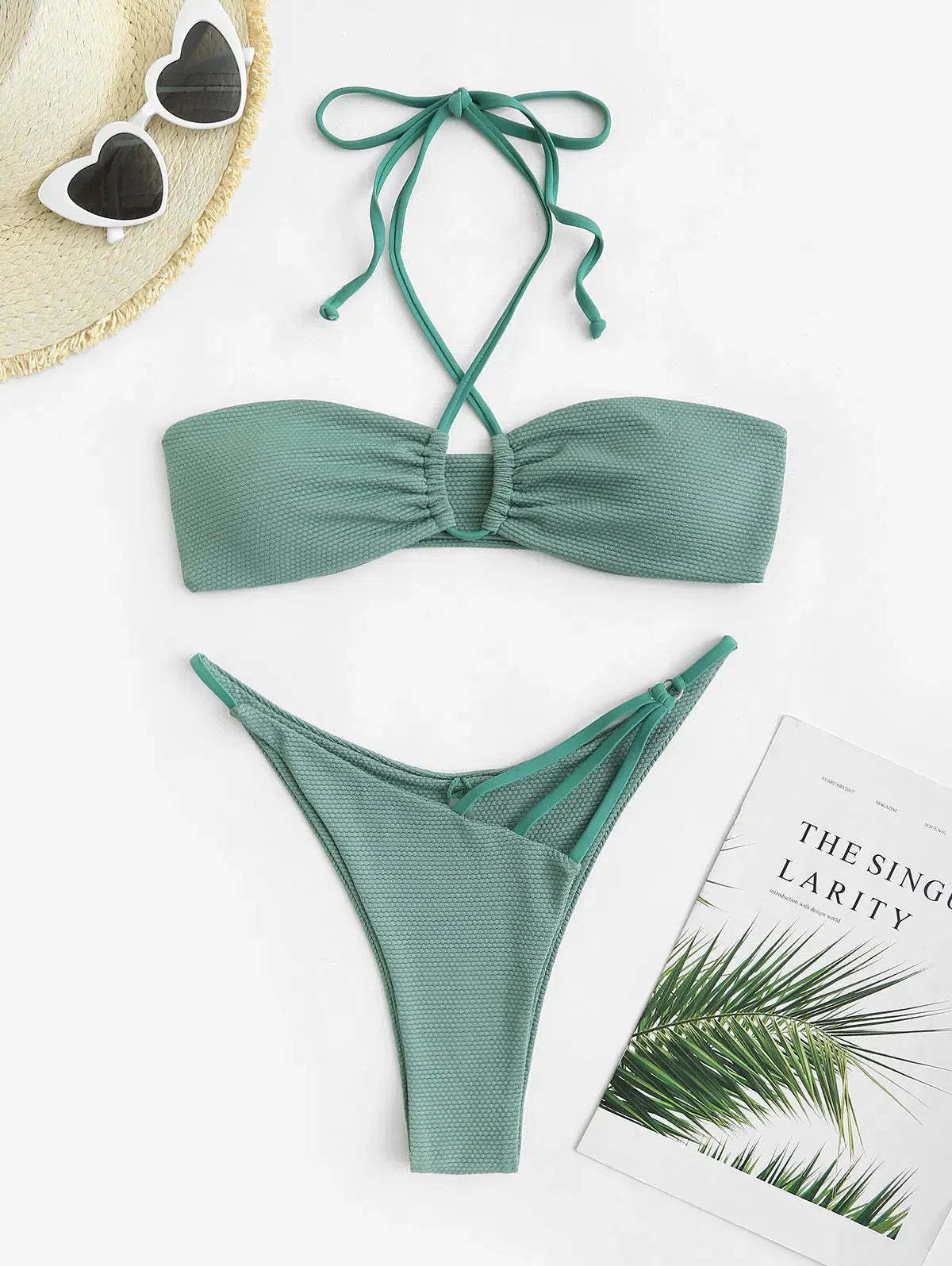 Featuring a stylish crisscross halter neckline. this bikini offers both fashion and functionality. The bottoms feature strappy sides for an added touch of allure. Made from high-quality. stretchy fabric. this set ensures a comfortable and flattering fit. Perfect for beach outings. poolside lounging. or tropical vacations. this bikini is a chic choice for any summer adventure.