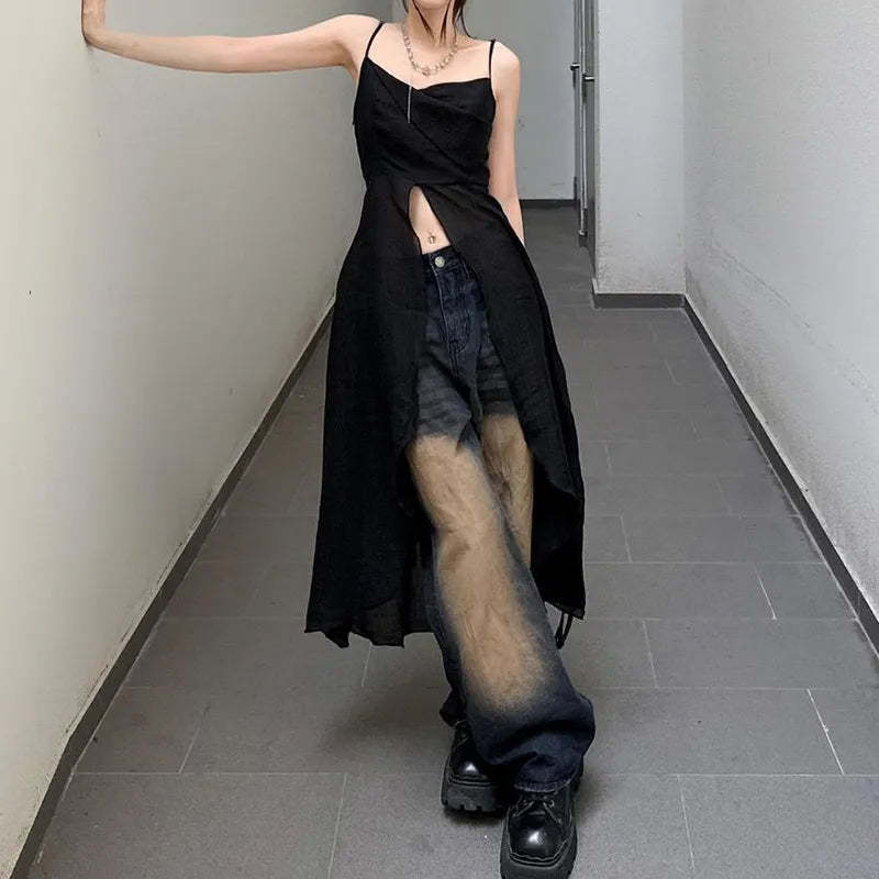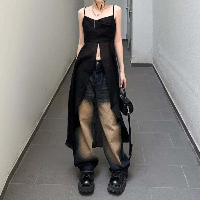 Experience versatility with this unique top that doubles as a dress. Featuring a side zip for easy wear and a flattering V-neck. its transparent fabric adds a grunge twist. making it ideal for festivals or parties. A standout piece for those who love to mix edgy and feminine styles.