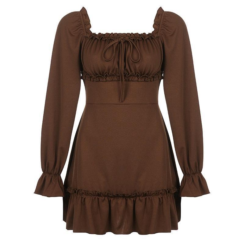 Discover the captivating fusion of comfort and style with this brown fairy grunge mini dress. Crafted from a blend of polyester and spandex. it boasts a trendy square collar. flare sleeves. and a slight stretch for a perfect fit. The ruffled detail adds a whimsical touch to its edgy aesthetic. It's an ideal choice for those seeking a unique blend of grunge and fairy tale charm in their wardrobe.