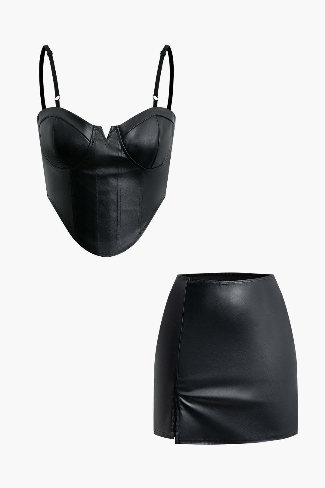 Faux Leather V-neck Bustier Cami Top And Split Mini Skirt Set
