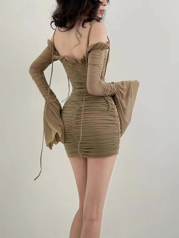 This off-shoulder mini dress is designed with dramatic flare cuffs and ruched details throughout. The fitted silhouette accentuates curves while the ruffled neckline adds a touch of sophistication. Ideal for evening events or a stylish night out. this dress pairs beautifully with strappy heels and minimal jewelry for an elegant yet striking look.