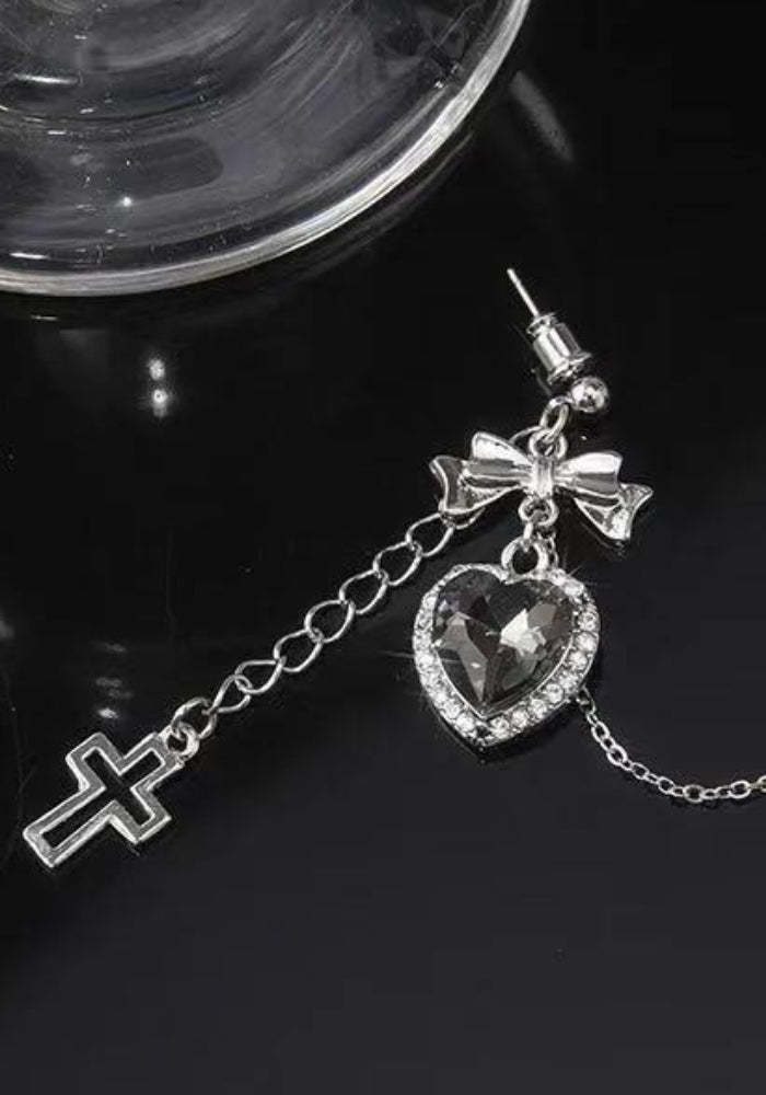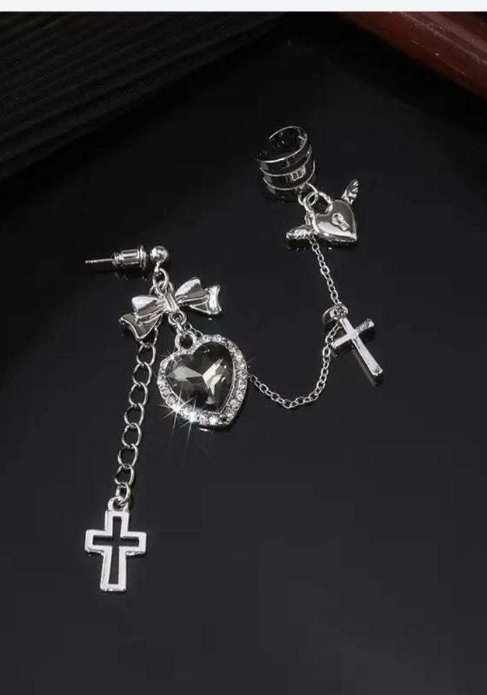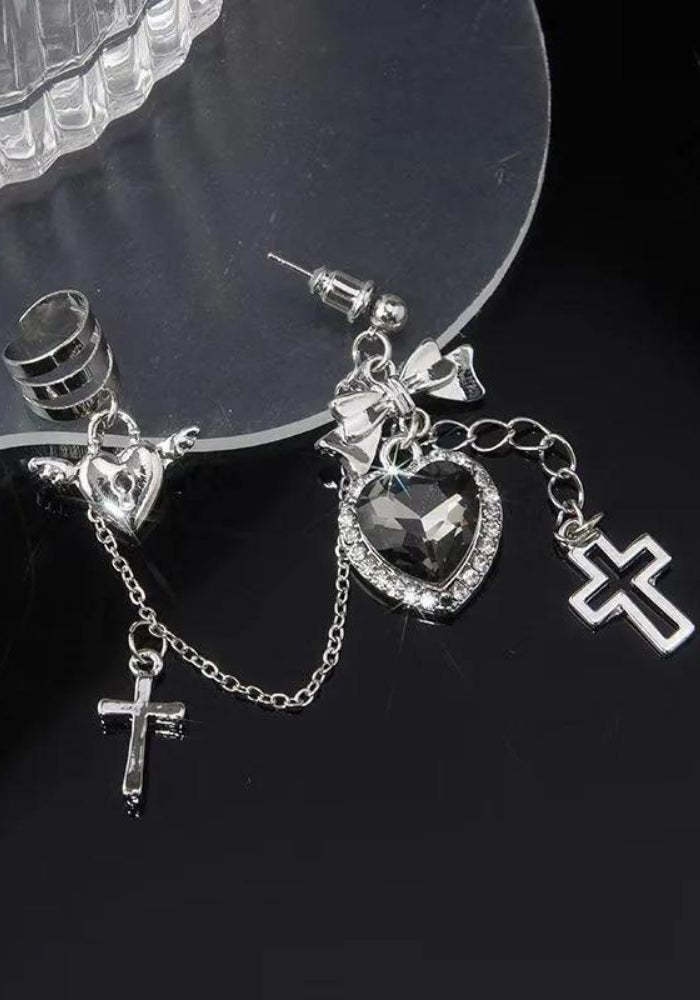 Embrace the goth aesthetic with our Heart Cross Chain Earrings. Featuring a black heart-shaped stone with a cross and bow. along with heart with wings accessory details. The combination with an ear cuff adds an extra edge to these zinc alloy earrings. creating a cool and unique style.