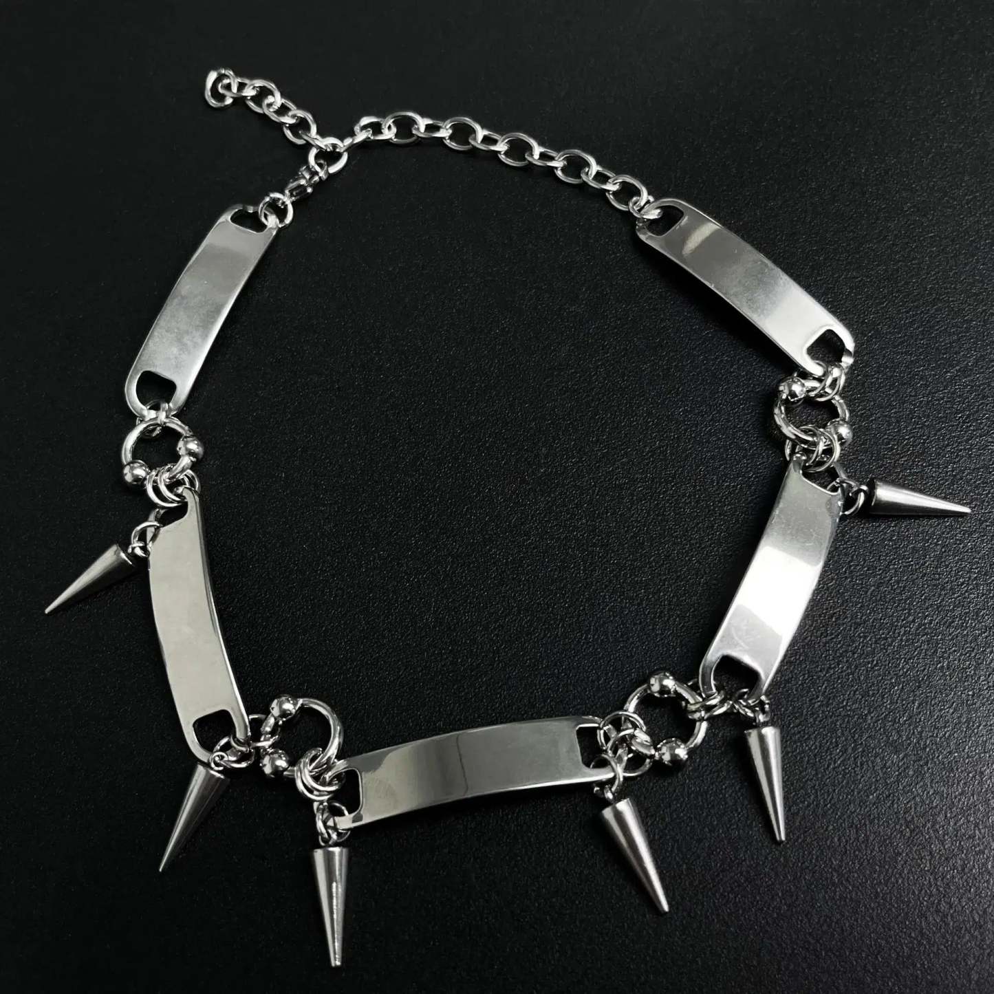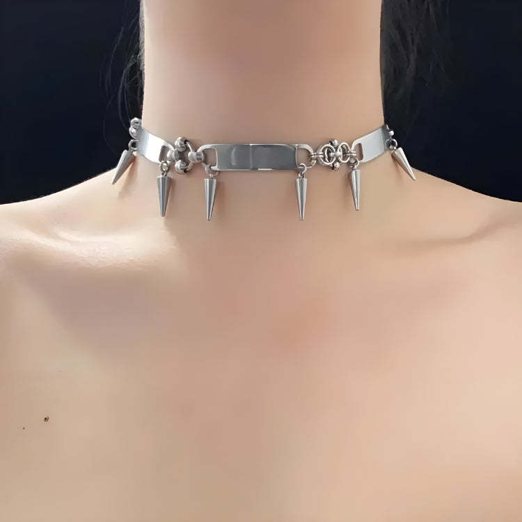 Embrace the goth style with this metal choker. featuring a spiked design. It's a bold statement piece for anyone interested in punk fashion. adding an edgy touch to streetwear looks.