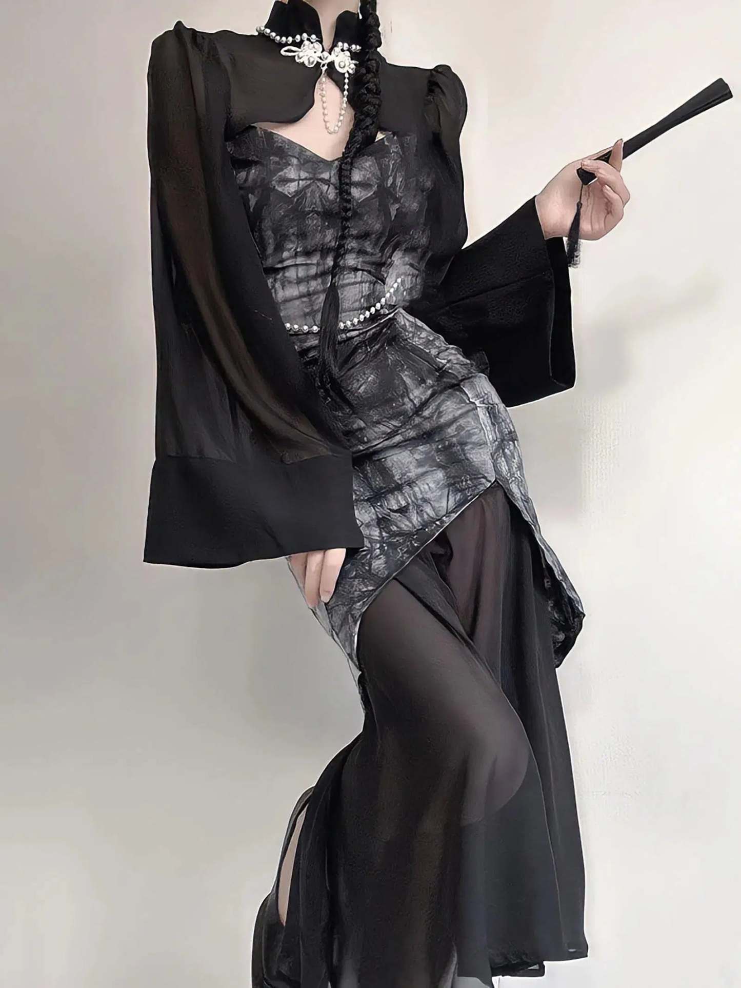 Dive into the darker. more mystical side of fashion with the Goth Wide Sleeve Midi Qipao Dress. It updates the traditional cheongsam with a gothic twist. showcasing a dark forest print. pearl bead embellishments. and seductive cut-outs. This dress blends traditional elegance with unique goth elements. perfect for festivals. parties. and those seeking a standout look.