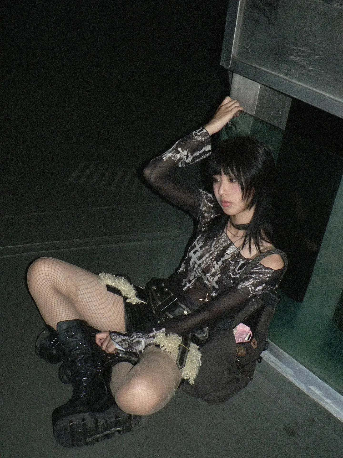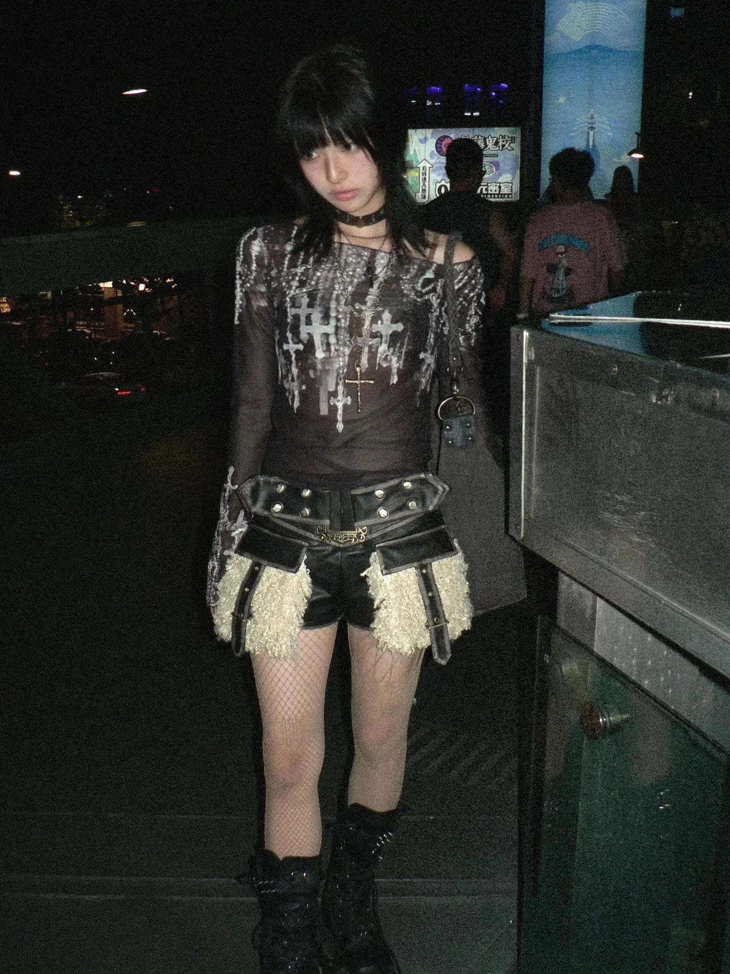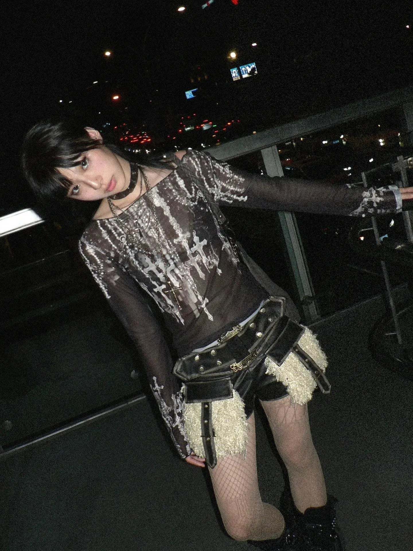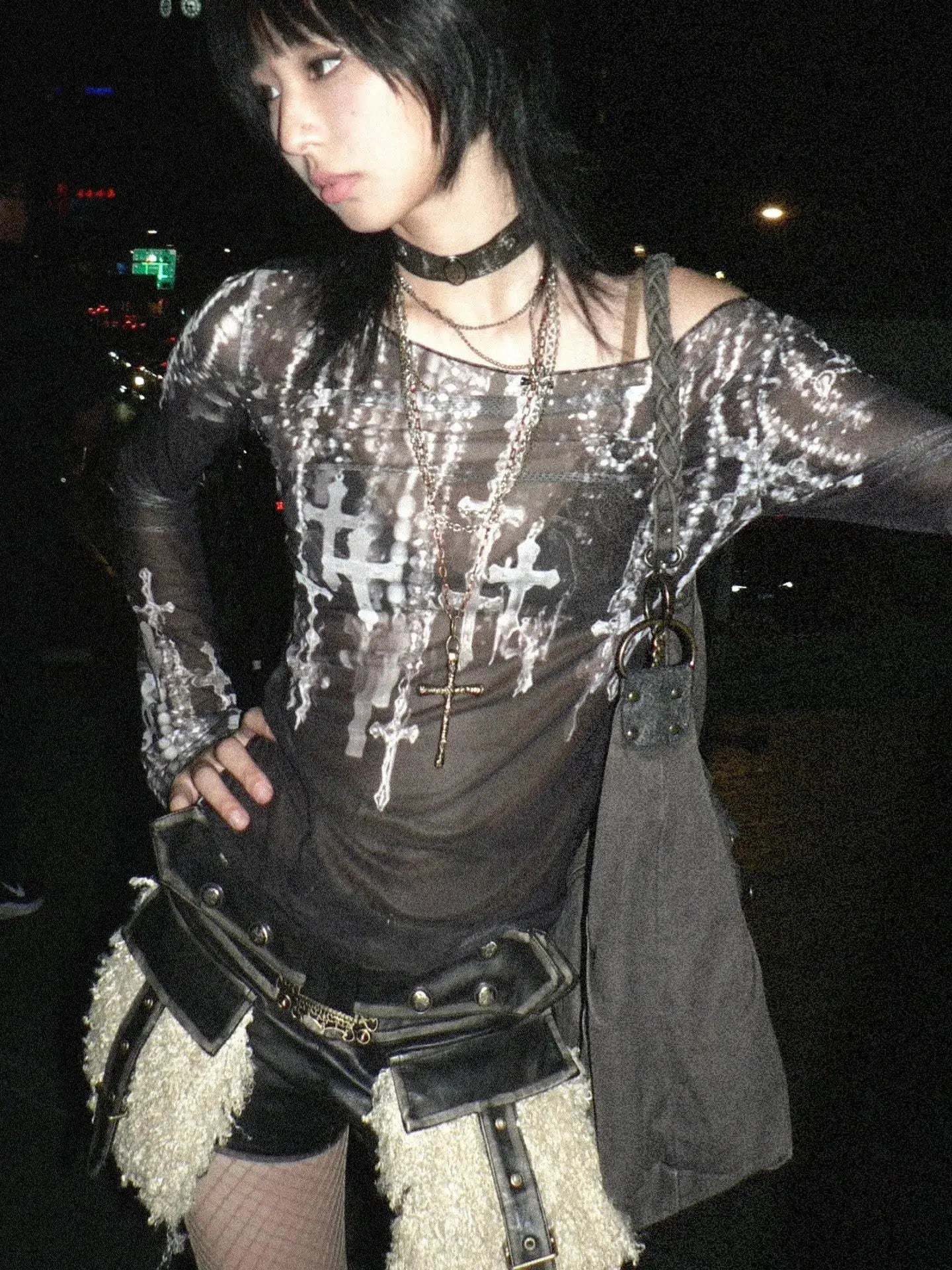 Embrace the grunge aesthetic with this bold top. showcasing a cross print on mesh material. Its wide neck and long sleeves cater to a punk. streetwear. or baddie style. ideal for anyone looking to add an edgy touch to their outfit.