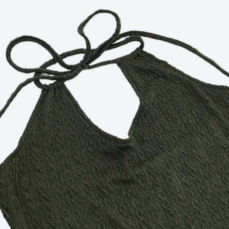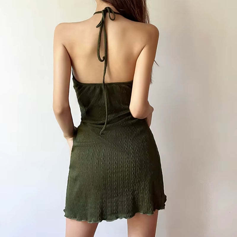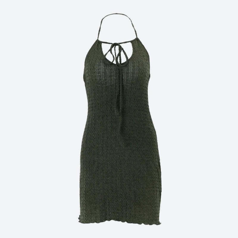Stay effortlessly chic with this halter neck knitted mini dress. The soft ribbed texture and flirty keyhole detail highlight your figure for casual days or weekend parties.