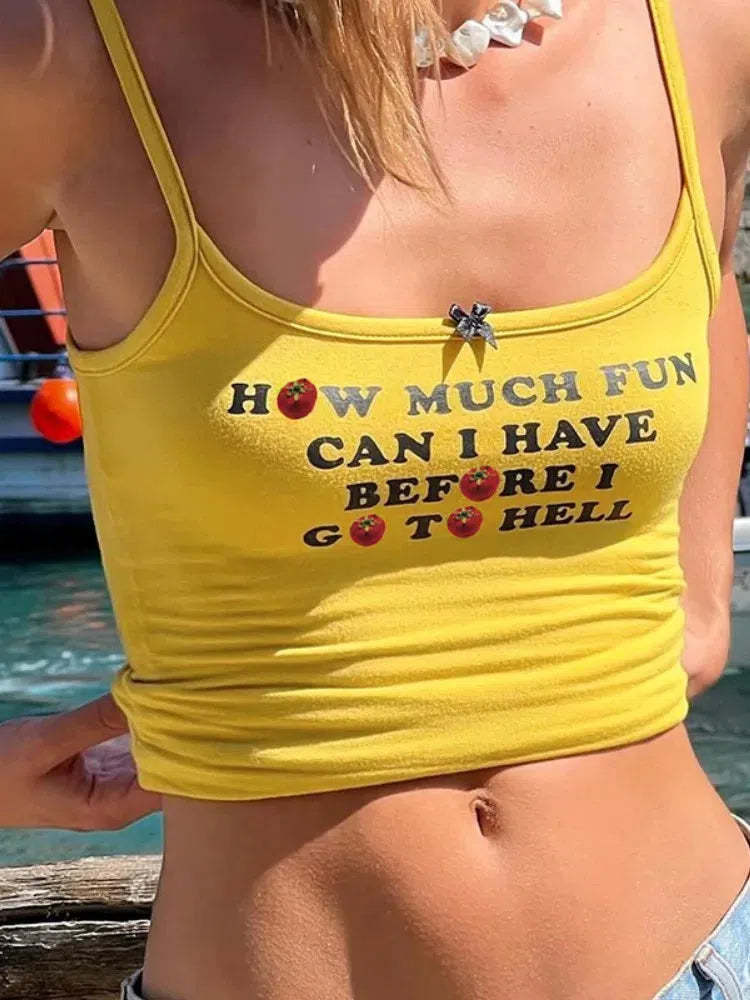 Unleash your playful side with the top. a vibrant addition to your casual wardrobe that keeps the fun rolling till the stars come out. This sunny yellow tank features a cheeky print that asks. "How much fun can I have before I go to hell?" accompanied by a whimsical guitar and flower graphics. Perfect for summer days or layering under a jacket for a night out.