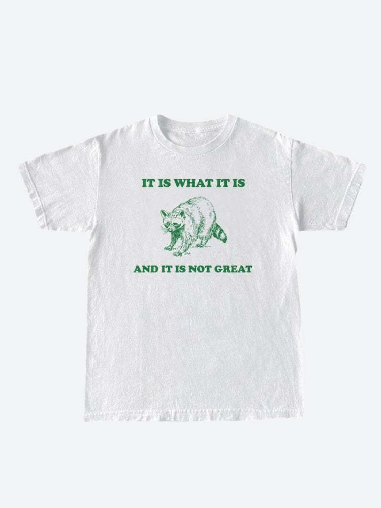 Find solace in the candid charm of this relaxed-fit tee. Its minimalist raccoon graphic paired with a wry. philosophical quote adds an effortlessly cool vibe to your casual wardrobe. Its soft. breathable fabric ensures comfort. while the earthy tones offer versatility for everyday style. Perfect for those who appreciate a touch of humor in their fashion statement.