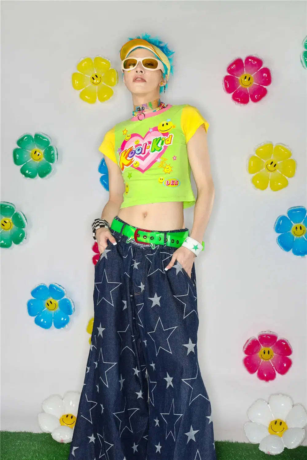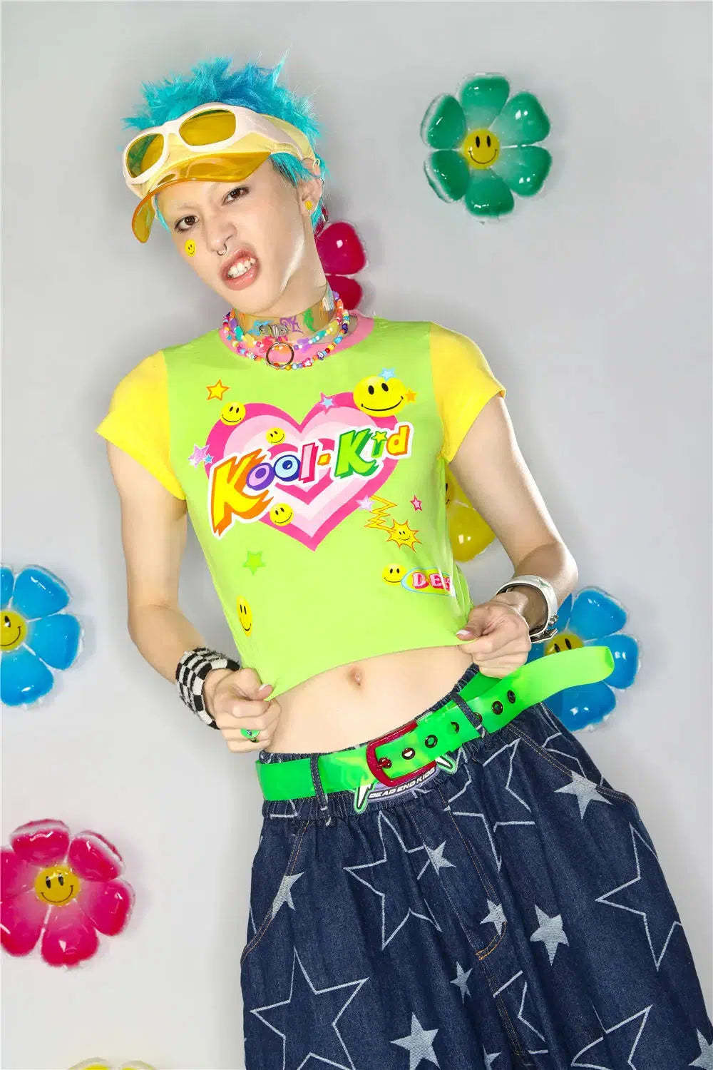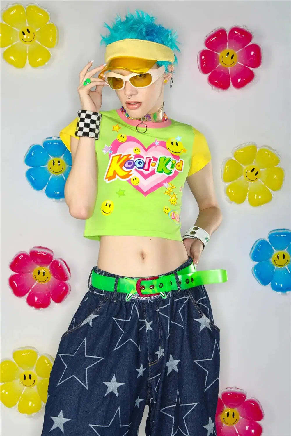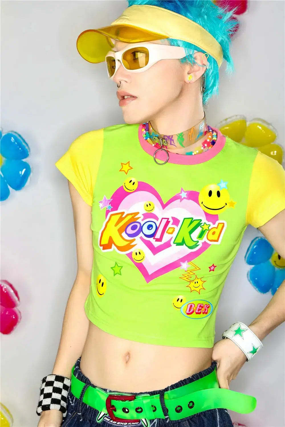 Brighten up your wardrobe with the Kool Kid Tee. This vibrant crop top features a playful graphic design with neon colors. smiley faces. and a heart logo. giving it a fun and nostalgic vibe. Perfect for adding a pop of color to your casual outfits. this tee is all about playful style with a retro twist. Ideal for those who love to stand out and embrace bold fashion choices.