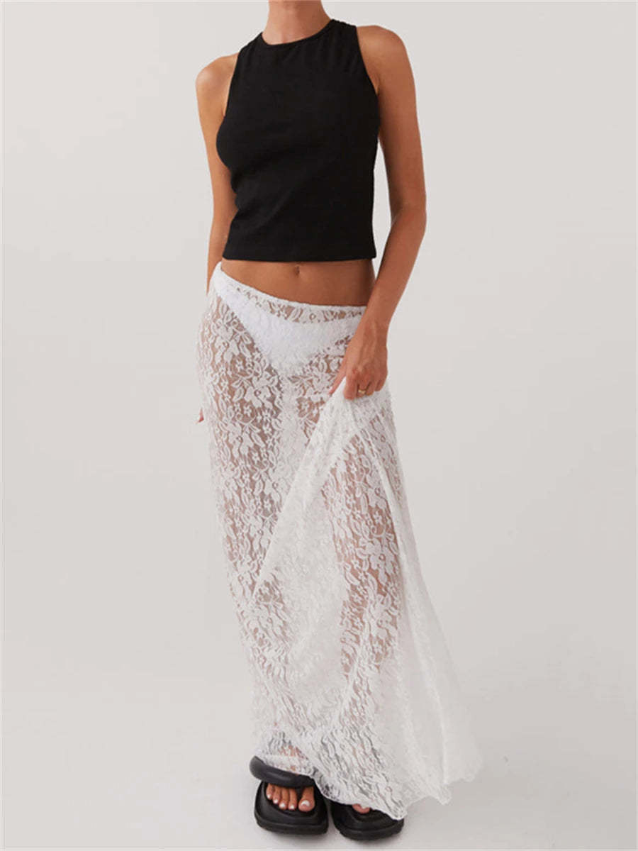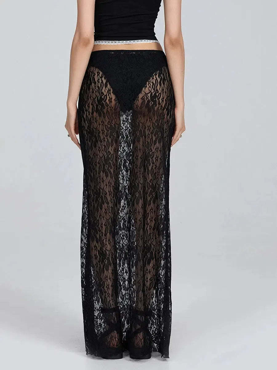 The low-rise waist accentuates your silhouette. while the sheer lace fabric offers a tantalizing glimpse of your legs. Perfect for pairing with a fitted top or a chic bralette. this skirt is ideal for both beachwear and evening outings. The fishtail cut adds a touch of drama and flair. making it a standout piece for any occasion.