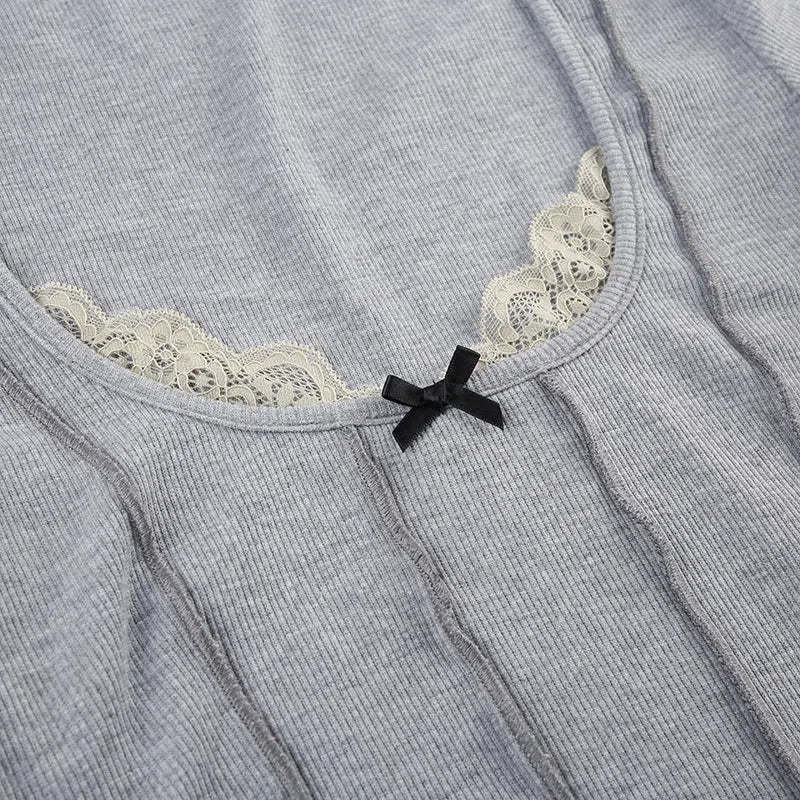 The Lace Trim Ribbed Crop Top adds a cute and feminine touch to any outfit with its delicate lace details and fitted ribbed fabric. Featuring a scoop neckline and subtle bow accent. this top is perfect for casual styling or layering with your favorite jackets.