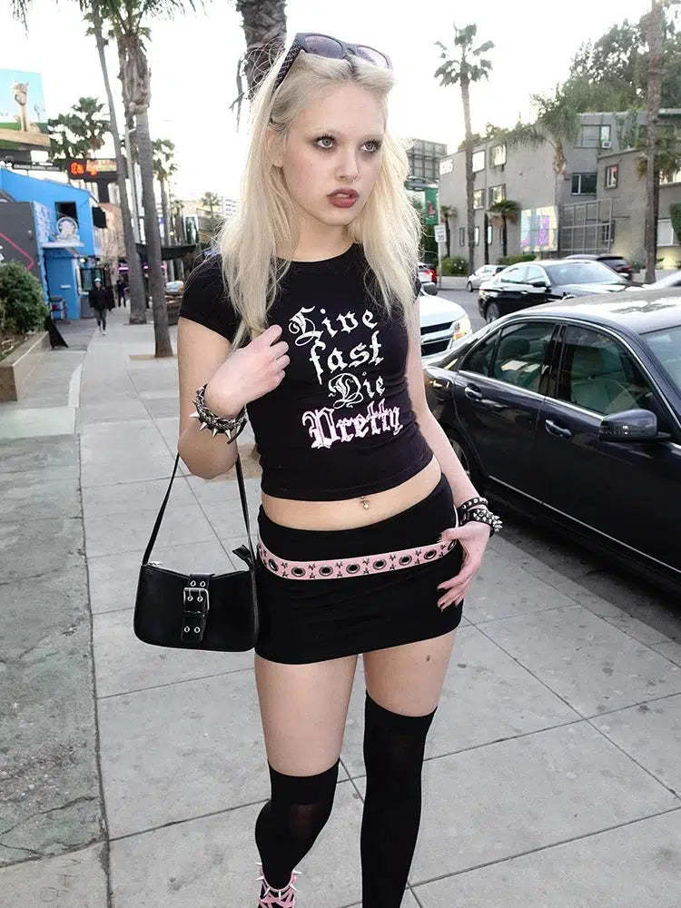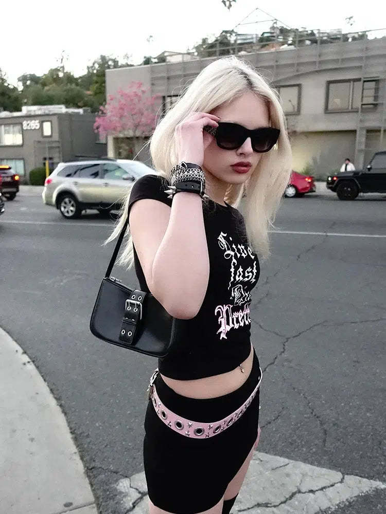 Its bold white lettering on a sleek black background captures the essence of grunge fashion. making it a perfect choice for those who love to stand out. The edgy slogan adds a touch of daring to any outfit. ideal for pairing with denim shorts or layered under a faux leather jacket. A must-have for rock enthusiasts and vintage style lovers alike.