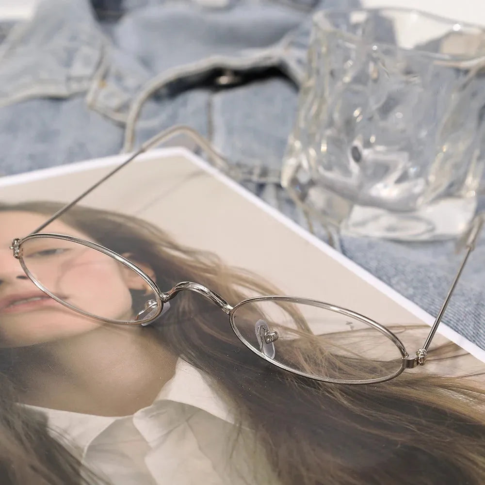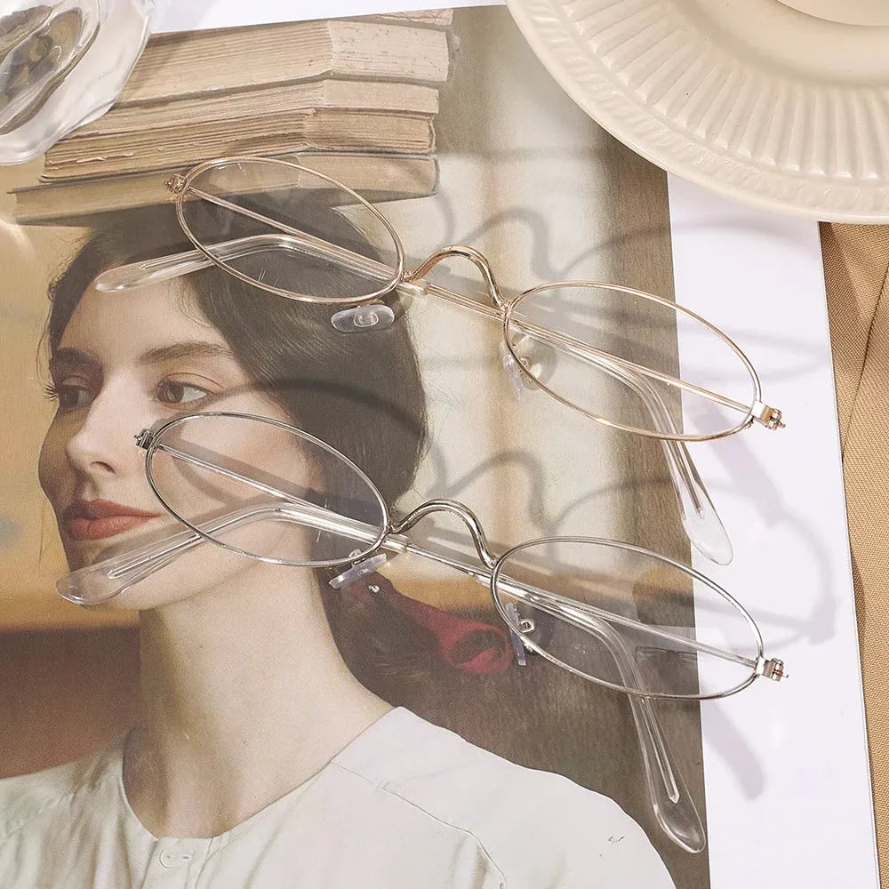 The Oval Glasses shown in the image have a delicate. vintage-inspired charm. With a minimal gold metal frame and narrow oval lenses. they give off a soft. intellectual vibe with a dash of Y2K cool.