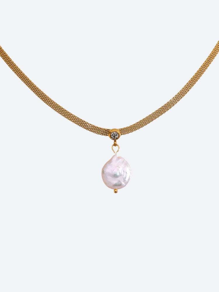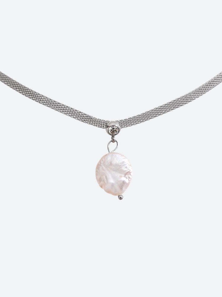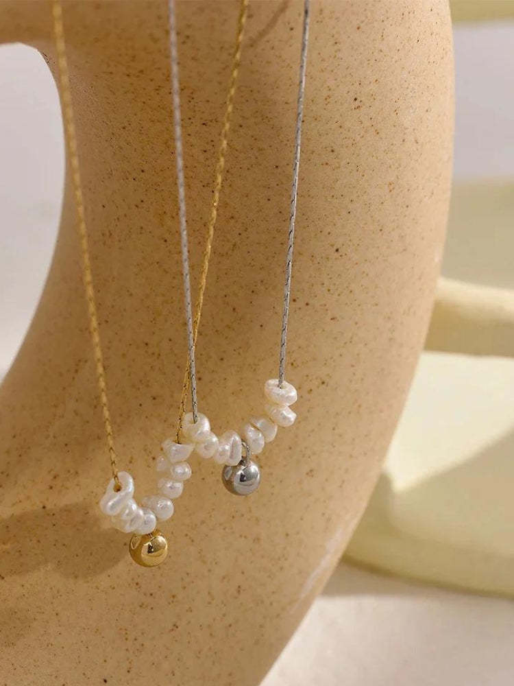 A delicate pearl necklace that combines elegance and simplicity. This piece features irregularly shaped pearls on a fine chain. ideal for layering or wearing alone. Its timeless design makes it a versatile accessory for any occasion.