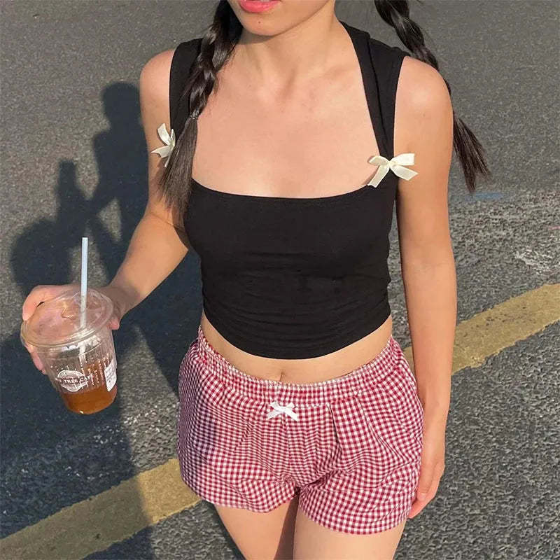 These Plaid Boxer Shorts with a cute bow detail bring a playful vibe to lounge looks or casual outfits. The soft cotton and elastic waist keep them comfy.
