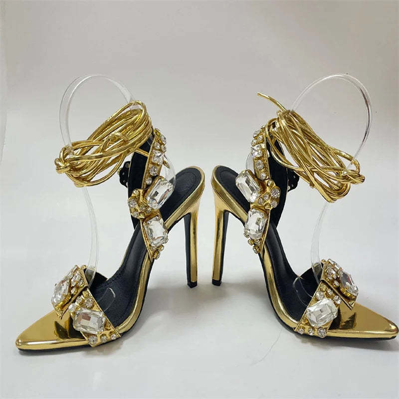These rhinestone high heels feature a metallic gold finish with oversized clear rhinestones and crystal studs along the ankle and toe straps. A lace-up ankle tie offers adjustable support. while the tapered stiletto heel adds height and sleek lines. Crafted for bold. dressed-up occasions. they deliver sparkle and structure in one standout pair.