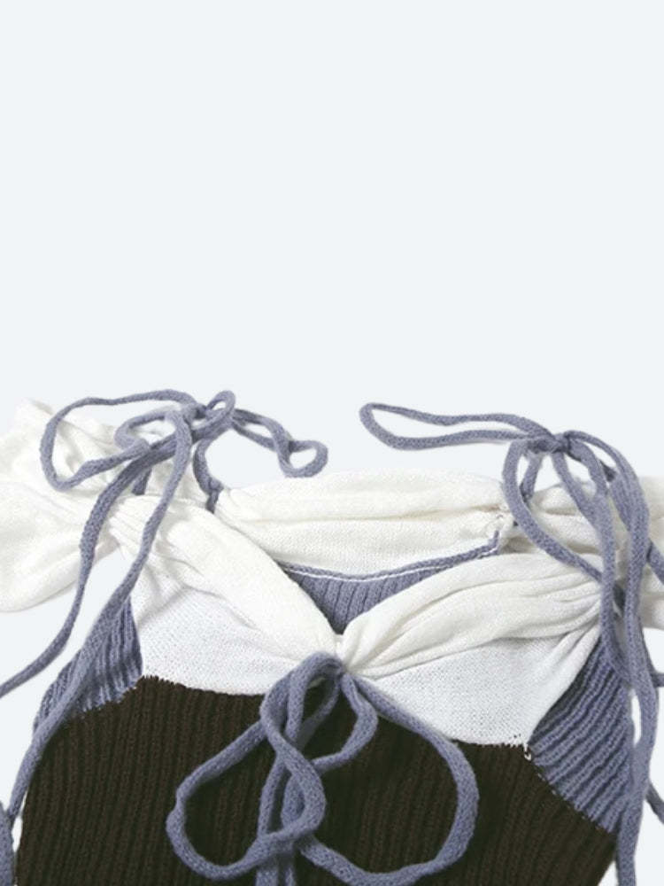 Cute. chaotic. and completely irresistible—this Ruched Knitted Mini Dress is a handmade-inspired masterpiece for the bold. With contrasting ribbed textures. a corset-like silhouette. and extra-long tie straps. it blurs the lines between cottagecore charm and sultry clubwear. Designed for those who want to turn soft into statement.