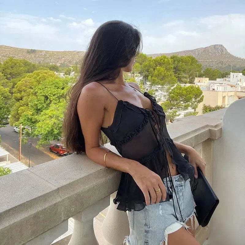 Framed with ruffles. it exudes a soft. ethereal quality. making it an excellent choice for layering over a sleek camisole or bold bralette. The lightweight. breathable fabric ensures comfort. while the sheer design adds a hint of intrigue to any outfit. Ideal for adding a touch of romantic flair to your ensemble. this top is perfect for a chic daytime look or an elegant evening out.