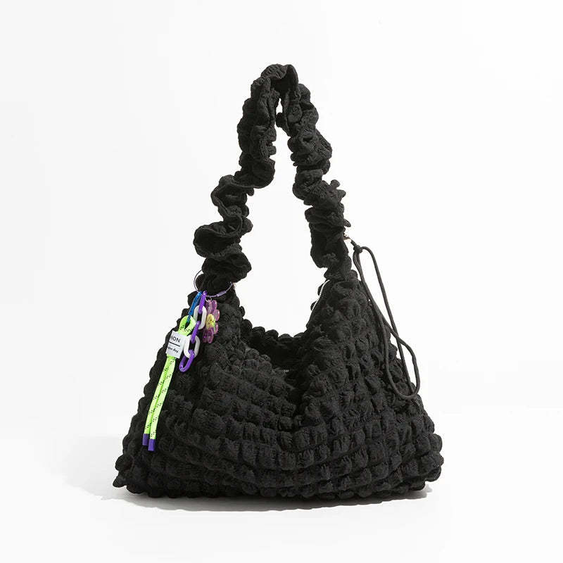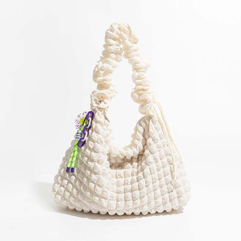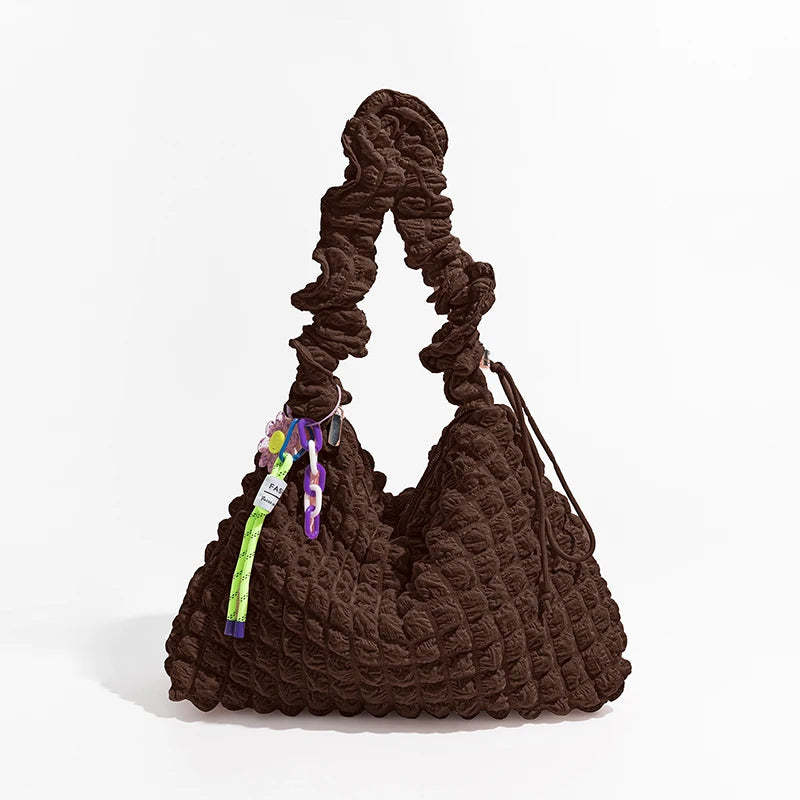 Cocoon yourself in the soft embrace of this quilted ruched hobo bag. a trendy companion that complements your day with both style and substance. Its plush texture and unique ruched design offer a fresh spin on the classic hobo silhouette. making it an essential accessory for the fashion-forward and the comfort-seeking.