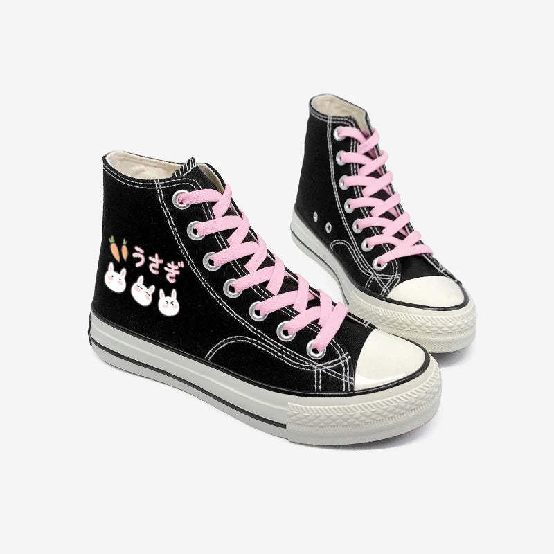 Black high-top canvas sneakers with adorable rabbit and carrot graphics. Pink laces add a cute touch. while the white rubber sole ensures comfort and durability. Ideal for a playful. stylish look.