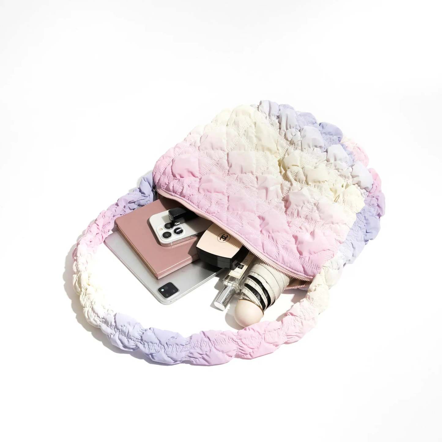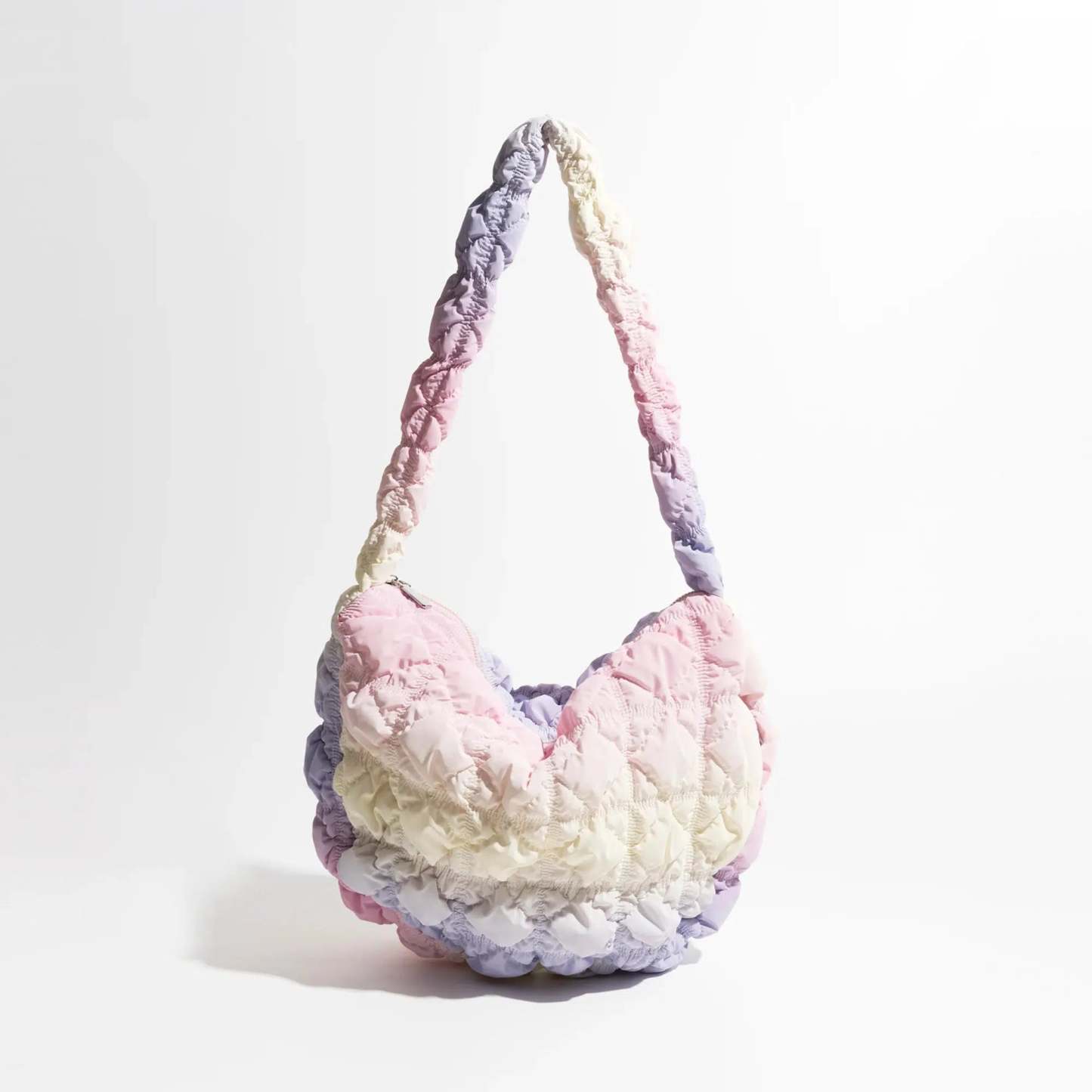 Discover the essence of spring with this enchanting shoulder bag. featuring a spectrum of pastel ruffles. Its quilted texture adds a touch of luxury and comfort. making it an ideal accessory for those gentle. sunny days. Whether paired with a light sundress or a casual tee. this bag promises to bring a delightful pop of color and a dash of whimsy to your look.