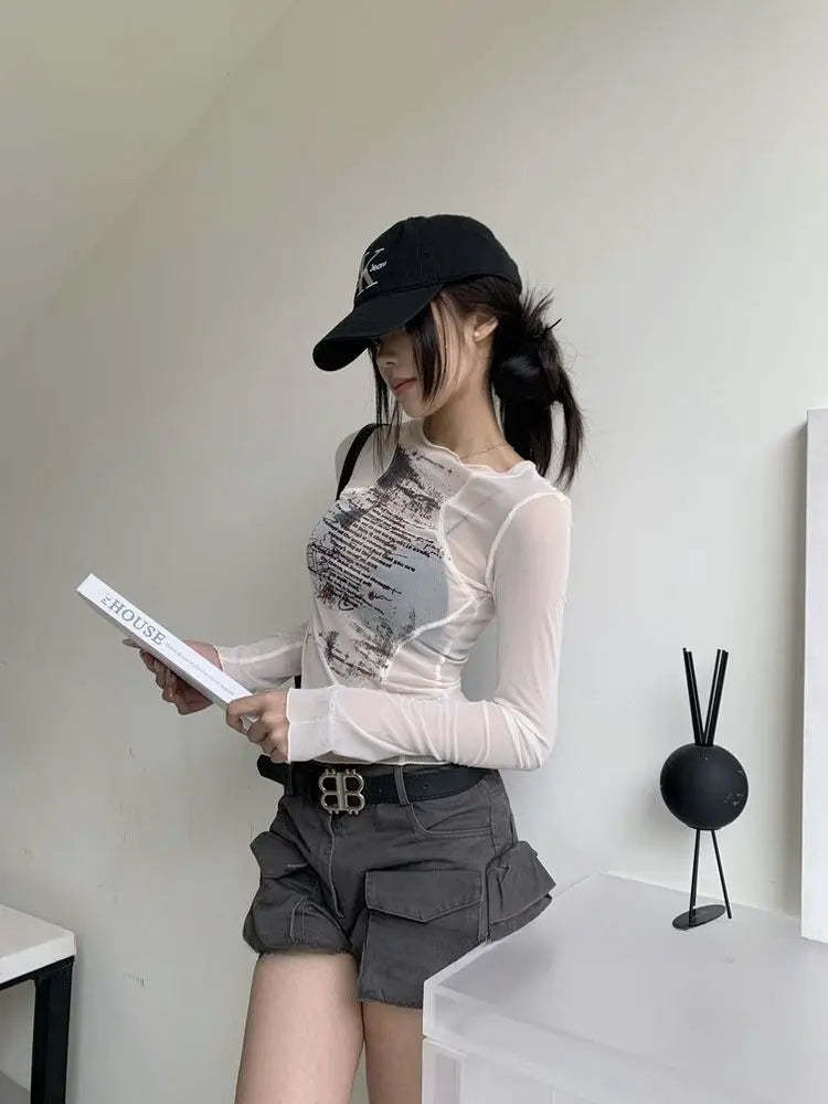This lightweight sheer mesh top with bold text print adds an edgy vibe to your wardrobe. Perfect for layering. its stretchy fabric and slim fit offer effortless style for casual outings or party nights.