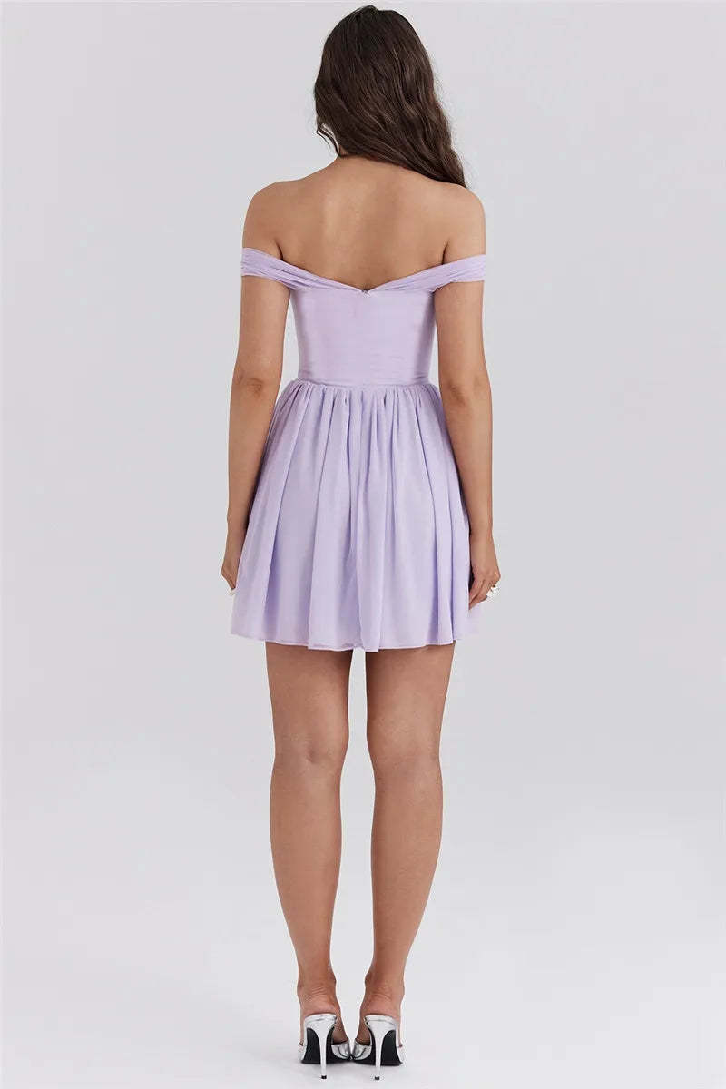 This beautiful lilac dress features a flattering off-shoulder neckline with a playful tie front detail. creating a feminine and sophisticated look. The fitted bodice and flared skirt enhance your silhouette. making it perfect for any special occasion or a stylish day out.