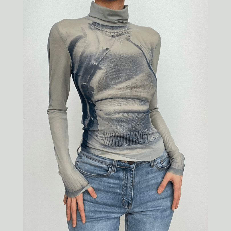 Turtle neck contrast print long sleeve sheer mesh top