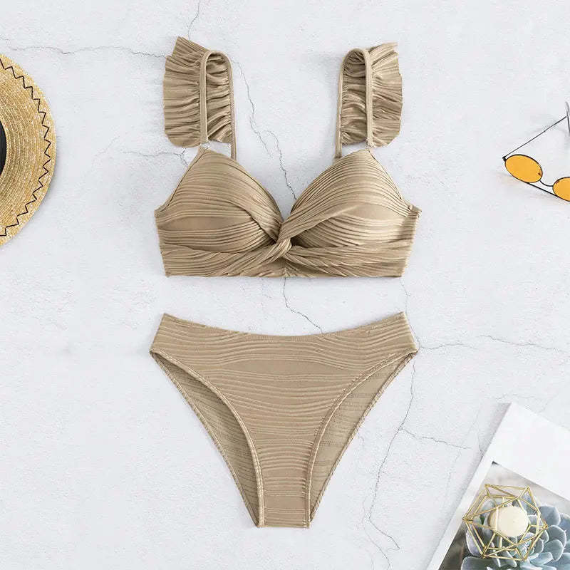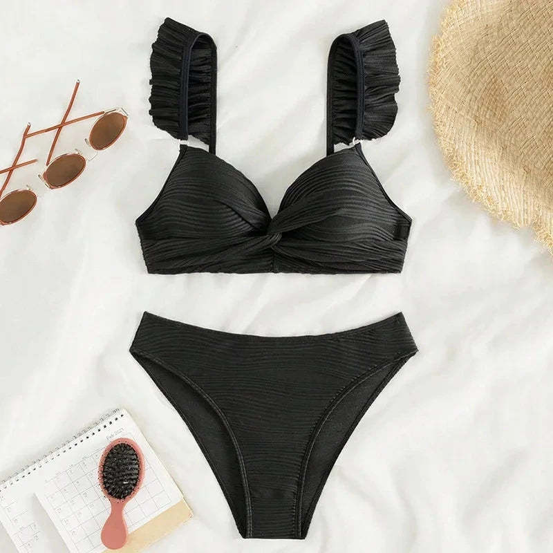Discover the perfect blend of style with this chic two-piece bikini set. The twisted bust design adds a trendy touch. while ruffled straps enhance its feminine appeal. High-waisted bottoms offer a flattering fit. made from soft. stretchy fabric for ultimate comfort. Ideal for beach days and poolside lounging. this bikini set ensures you look and feel your best.