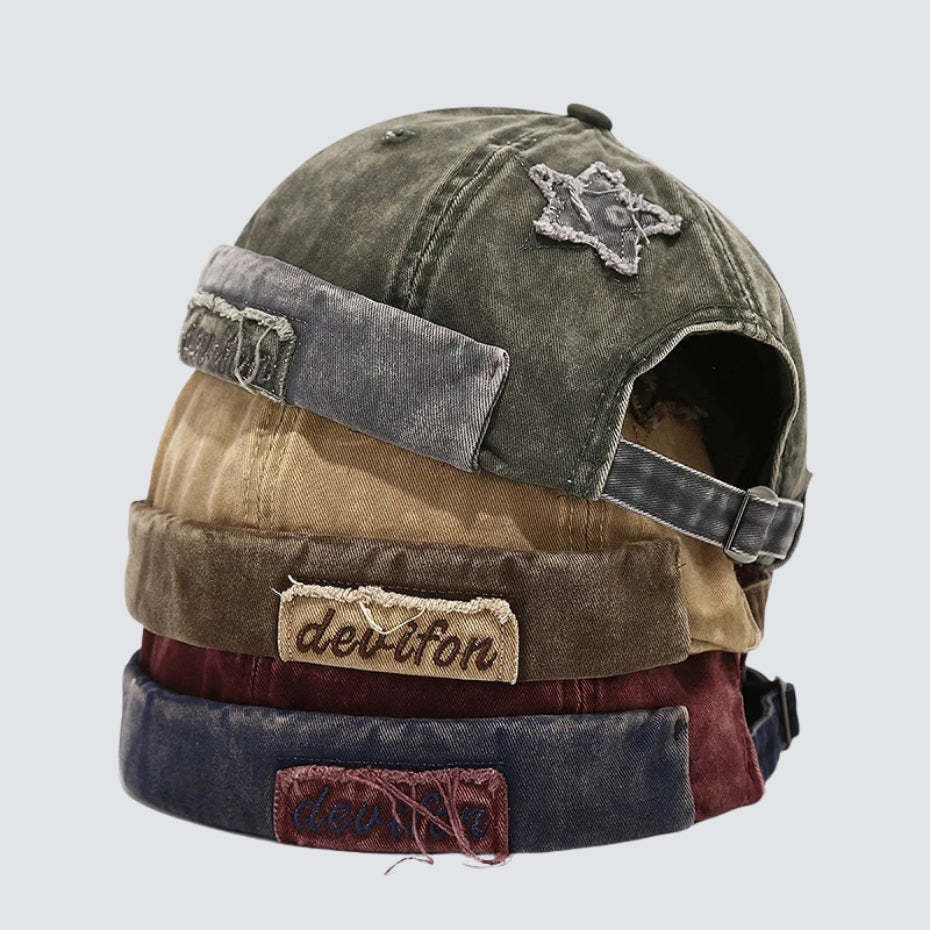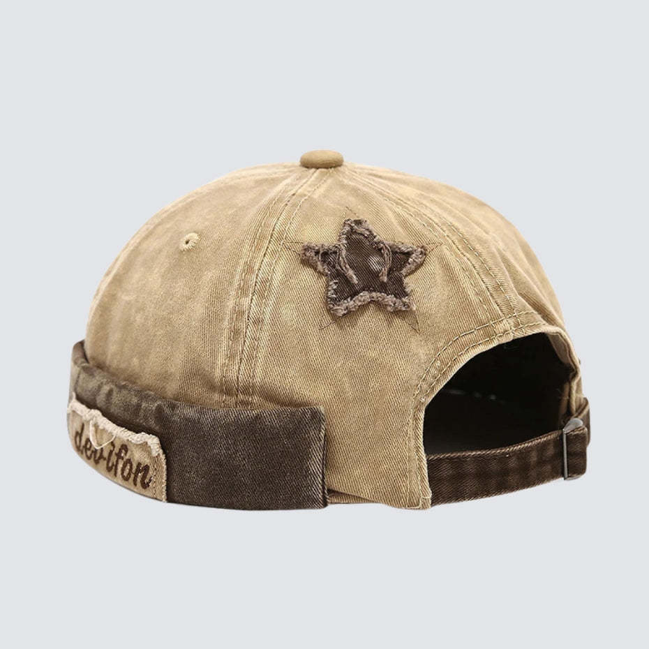 This washed star cap brings a vintage. worn-in feel with its multi-tone panels and soft distressed finish. The embroidered star patch adds character. while the mixed fabrics around the brim and back give the cap a unique. handcrafted look. It features an adjustable strap for a comfortable fit. making it easy to style with casual streetwear or laid-back outfits. The washed texture gives the cap a natural fade that feels authentic and relaxed. making it a versatile everyday accessory for modern men's fashion and effortless men style.