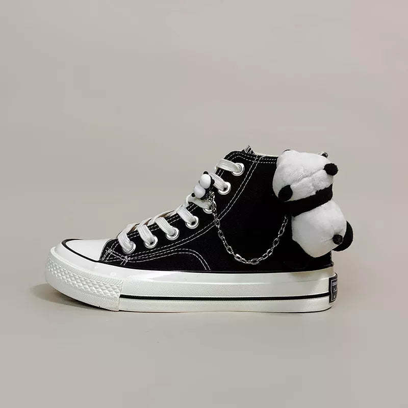 Stride with quirky flair in these black-and-white panda canvas shoes. Featuring plush accents and playful chains. these kicks are a bold statement for any Weirdcore enthusiast. They pair perfectly with frilled socks for a look that's both whimsical and street-style ready.