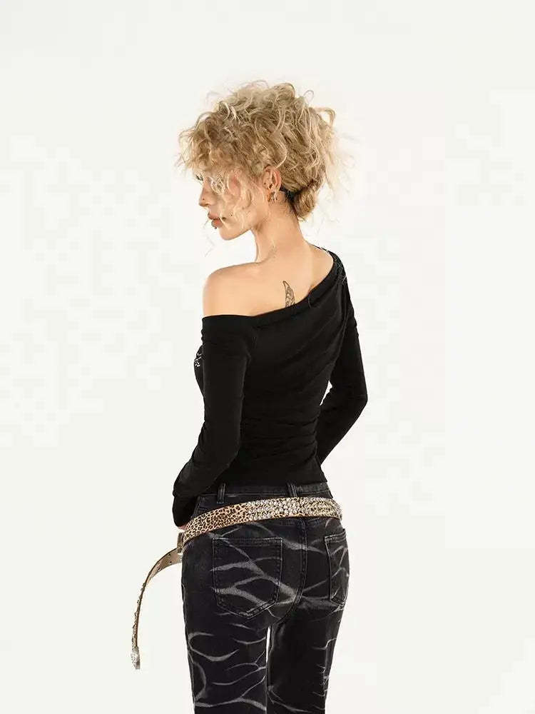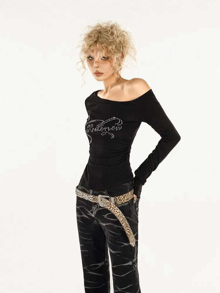 The Y2K Rhinestone One Shoulder Top is a must-have for lovers of early 2000s fashion. Designed with a sleek off-shoulder cut and shimmering rhinestone lettering. this top exudes effortless glam with an edgy. nostalgic vibe.